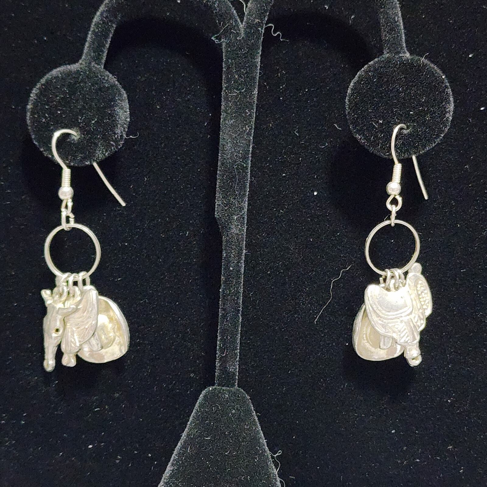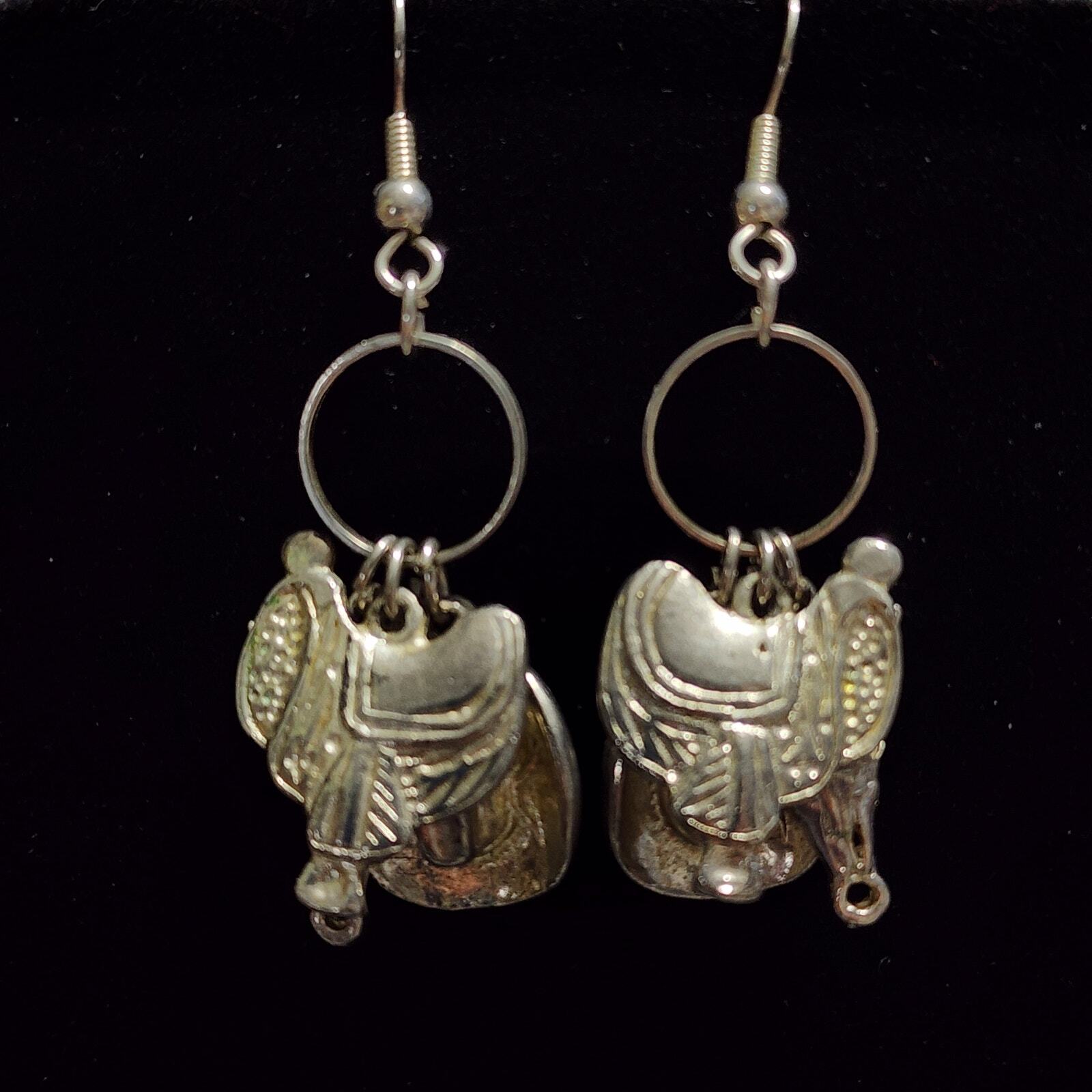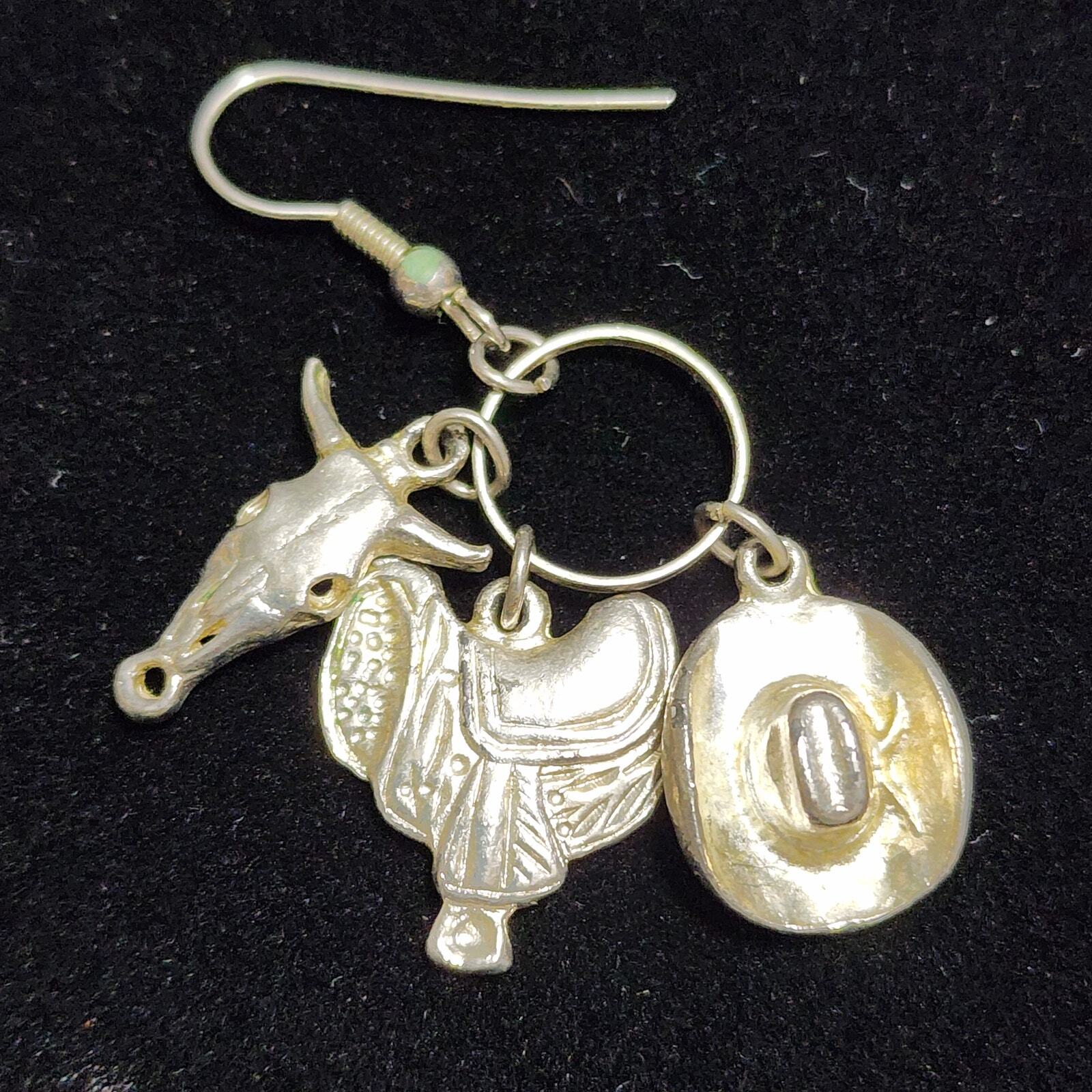 Cowboy Western Theme Silver Tone Dangle Earrings Cowboy Hat Saddle American West