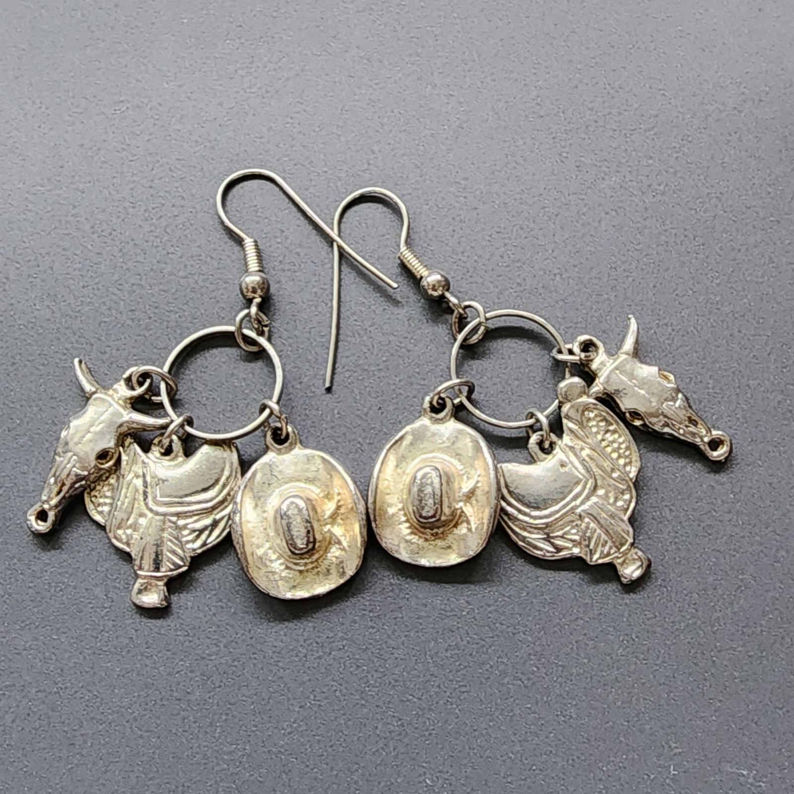 Cowboy Western Theme Silver Tone Dangle Earrings Cowboy Hat Saddle American West Features Three Charms: Longhorn steer skull, a western style saddle, and a cowboy hat