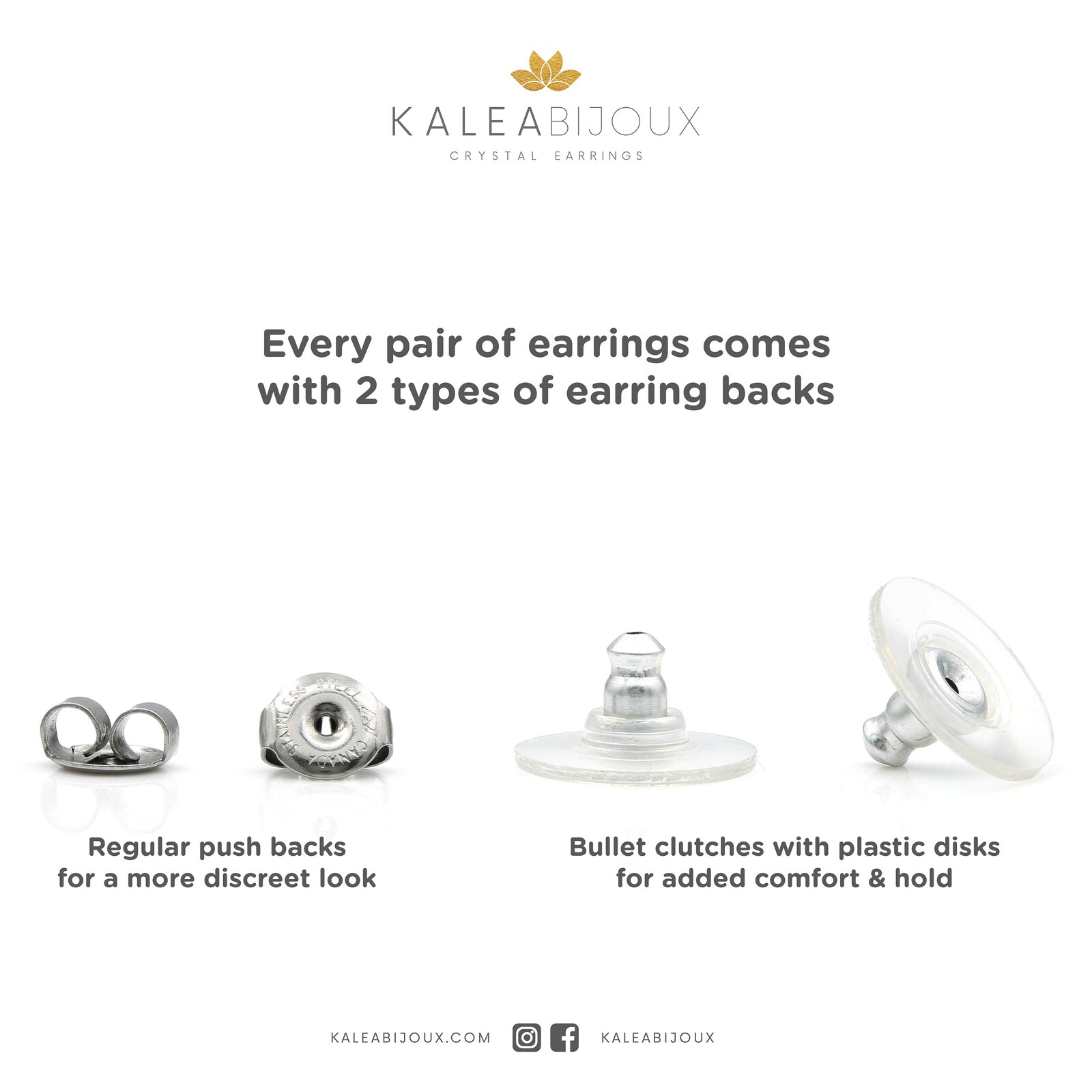Every pair of earrings comes with two types of earring closure: one set of regular push backs and one set of bullet clutches with plastic disks for more comfort.