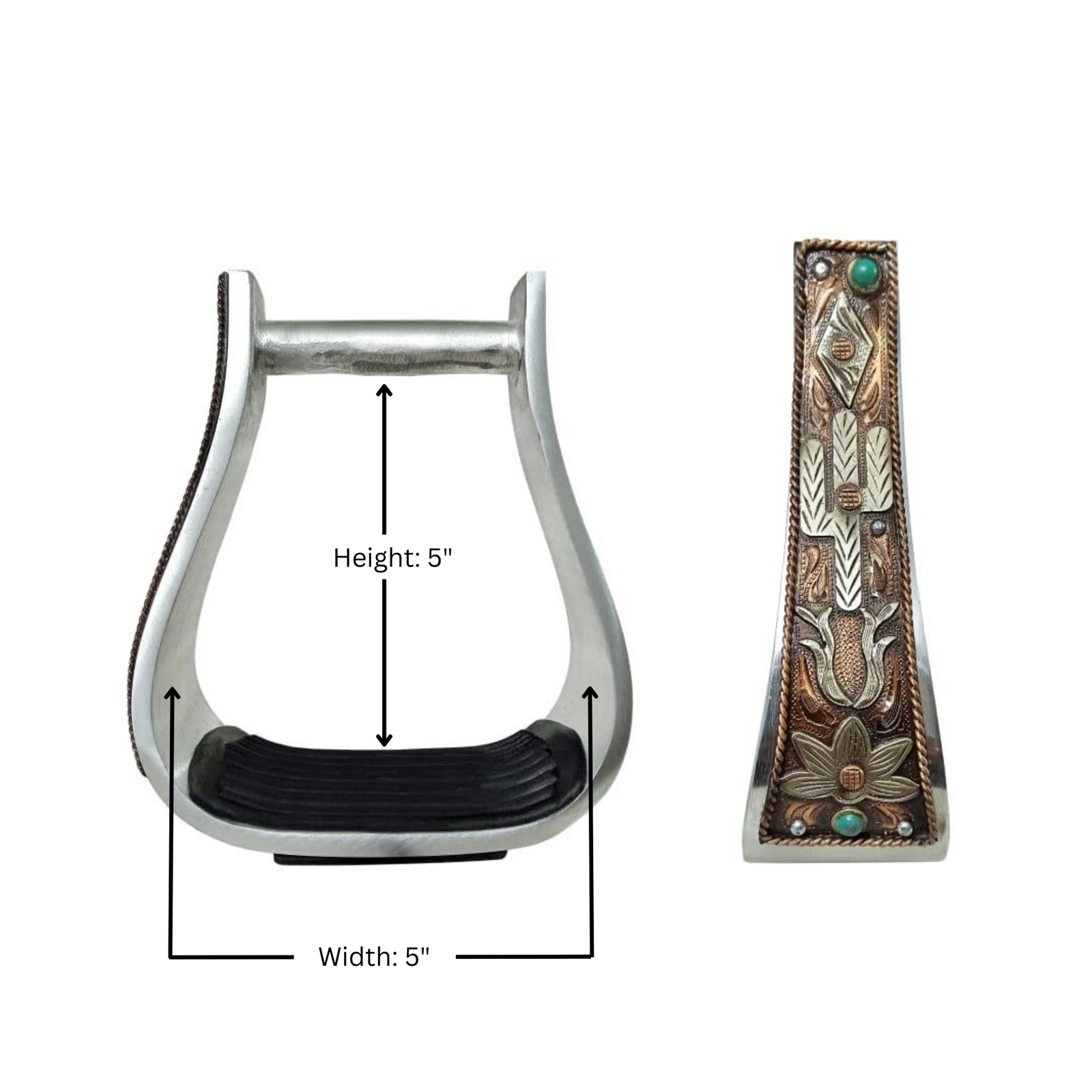 Challenger western straight barrel stirrups made from lightweight durable aluminum. These unique stirrups come beautifully accented with an antique copper cactus engraved design, and turquoise stones. These stirrups are made to endure every day use, making them perfect for the arena or, your everyday trail rider. Features tan leather accents, and a rubber grip tread to help prevent slippage. Stirrup measurements are as follows; 5" width, 5" height, 3" neck, and 2" tread.