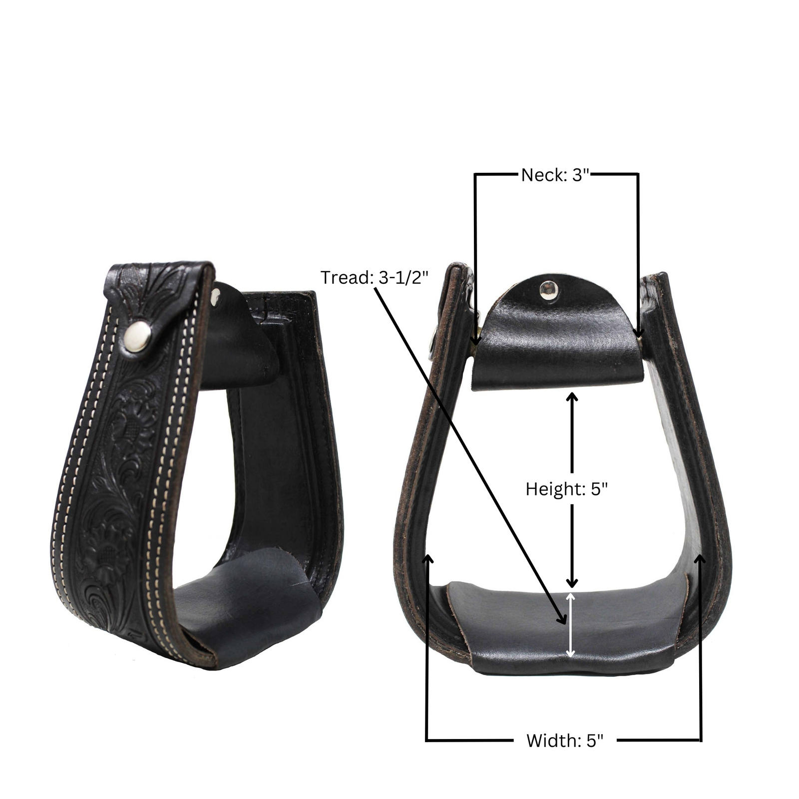 Challenger western stirrups wrapped in full-grain black leather. Stirrups are accented with a hand-tooled floral design, and white contrast stitching. The leather tread plate gives added traction in wet conditions. Double stitched throughout for durability. Inside measurements are 5" wide, 5" tall, 3" neck, and 3-1/4" tread.