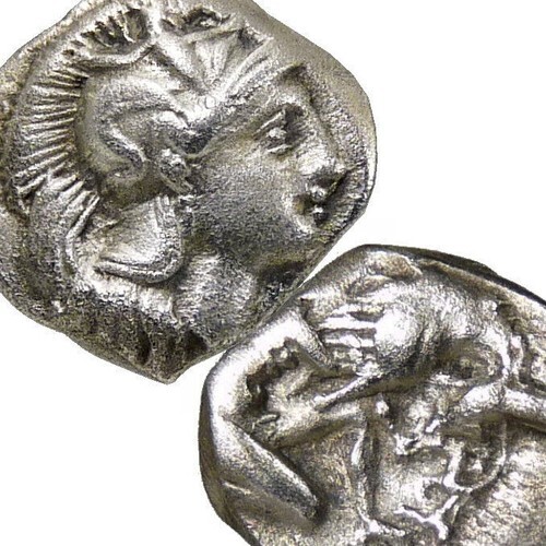 Obverse: Helmeted head of Athena right, with helmet with Skylla hurling a rock.