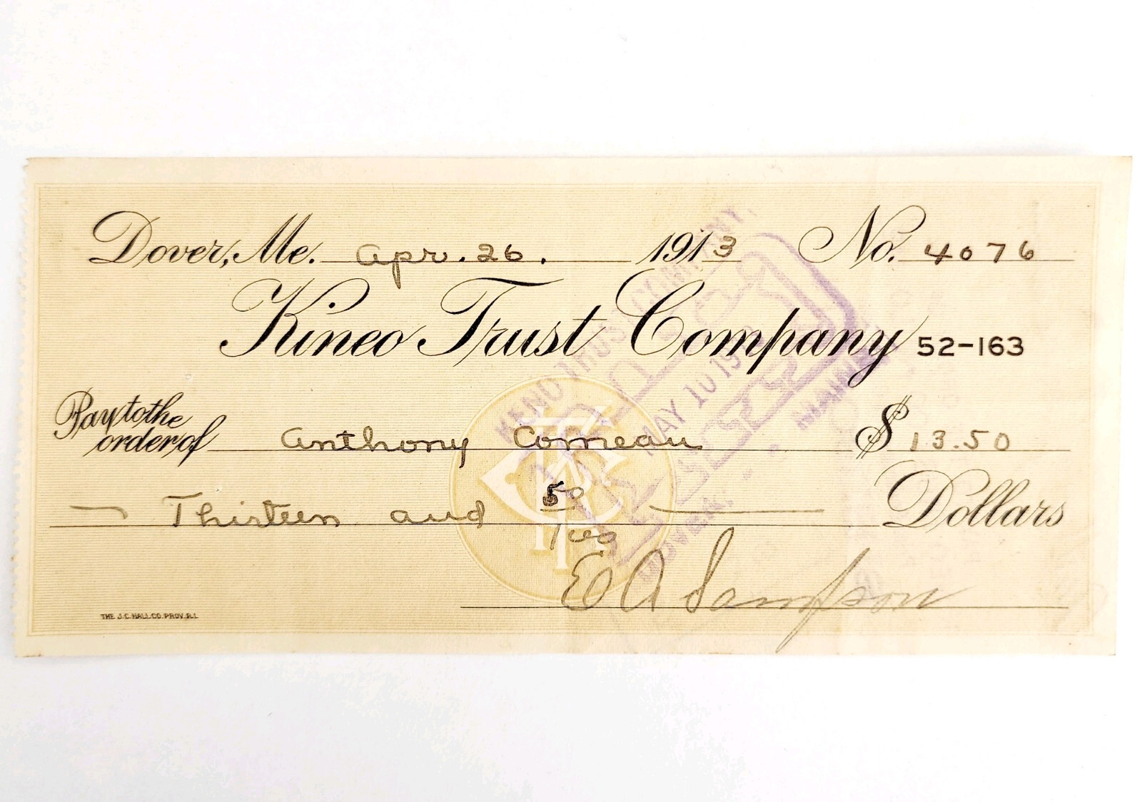 1913 Kineo Trust Company Bank Check E.A. Sampson Dover Maine Signed 4076 CHX6