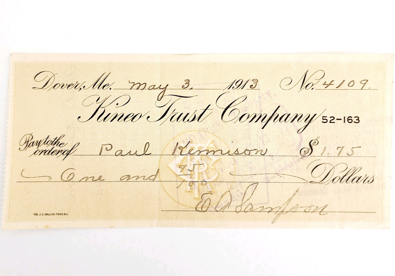 1913 Kineo Trust Company Bank Check E.A. Sampson Dover Maine Signed 4109 CHX5
