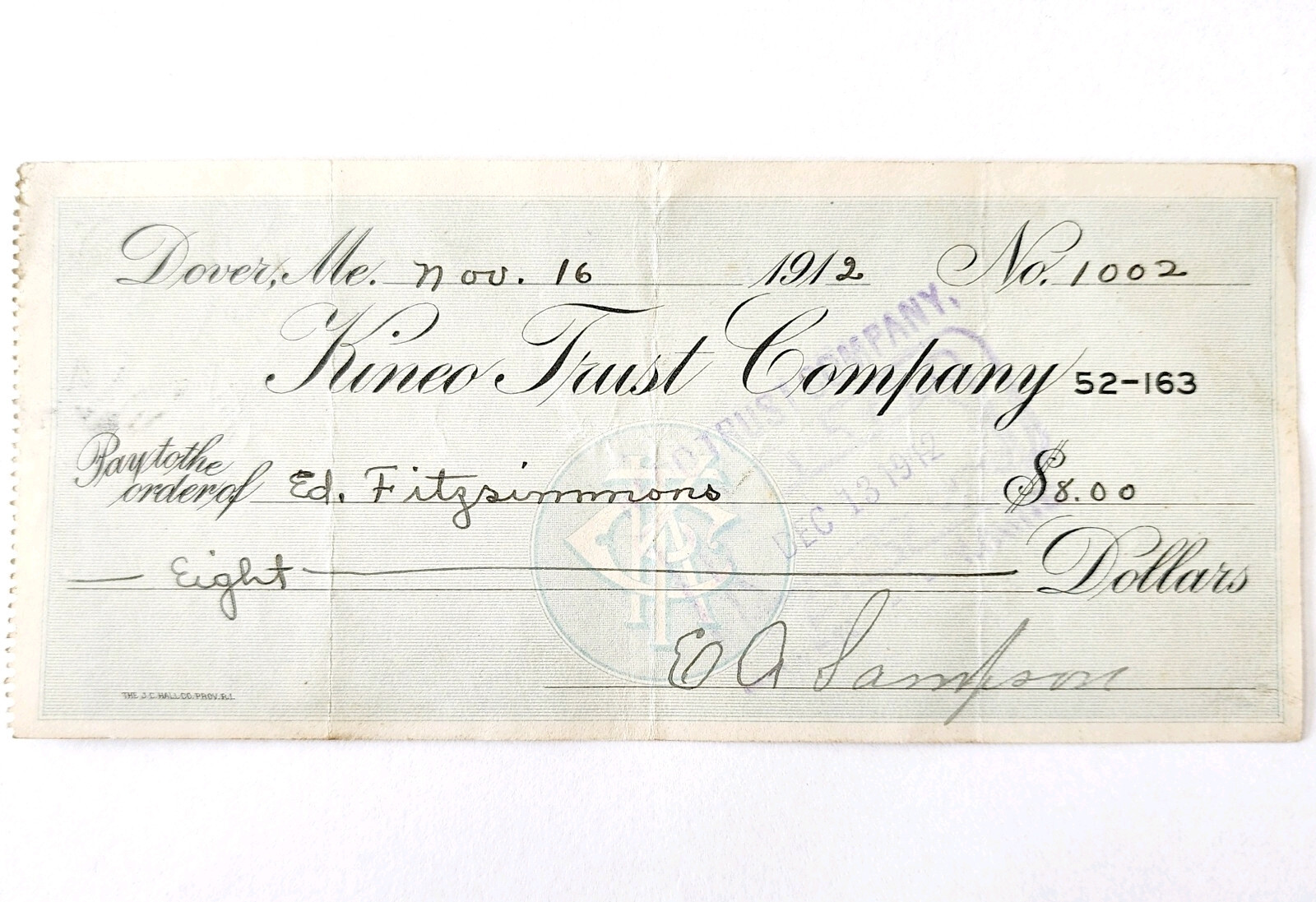 1912 Kineo Trust Company Bank Check E.A. Sampson Dover Maine Signed 1002 CHX3