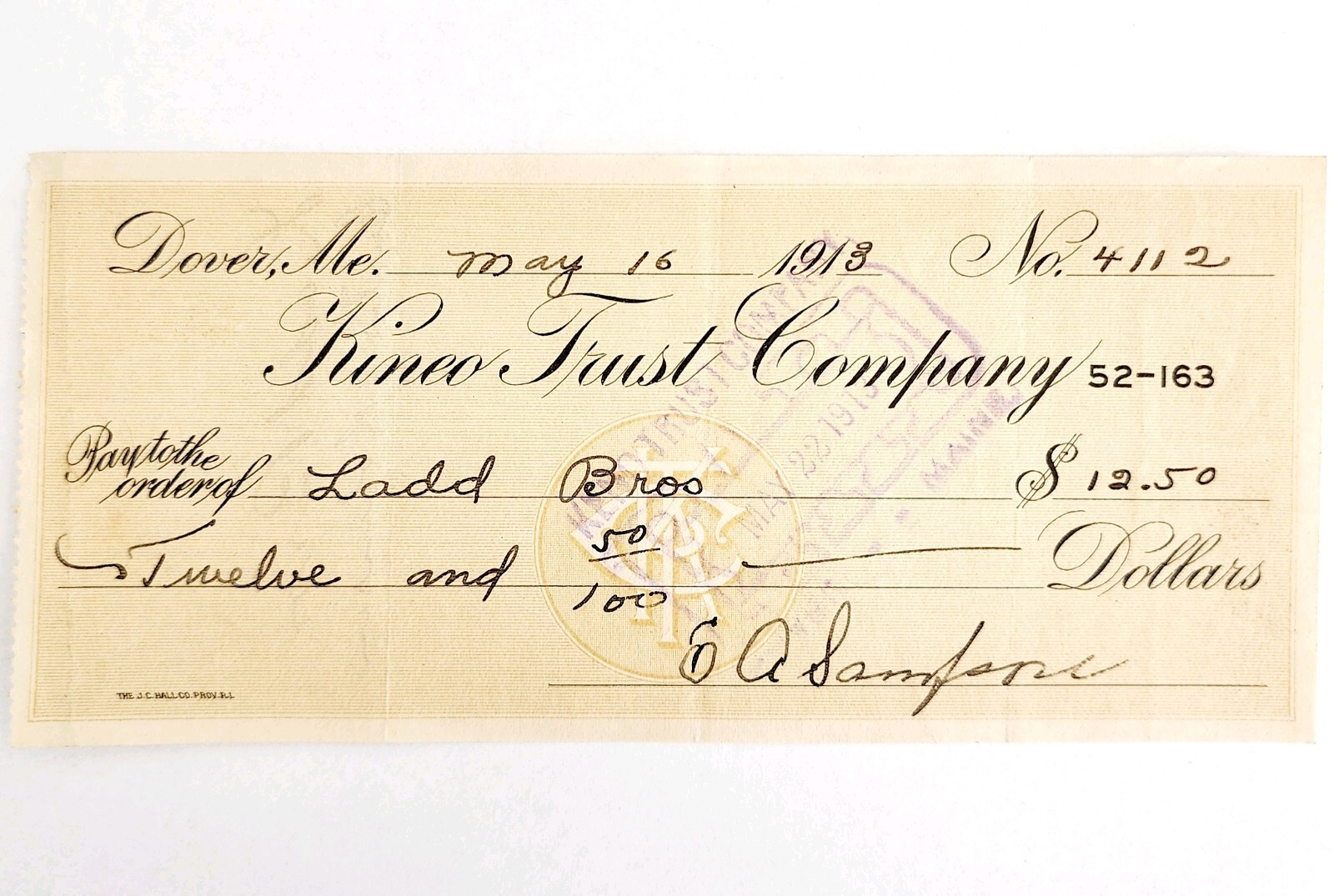1913 Kineo Trust Company Bank Check E.A. Sampson Dover Maine Signed 4112 CHX5
