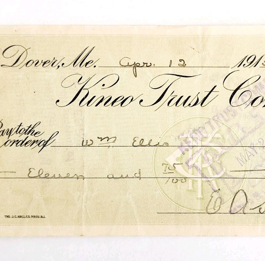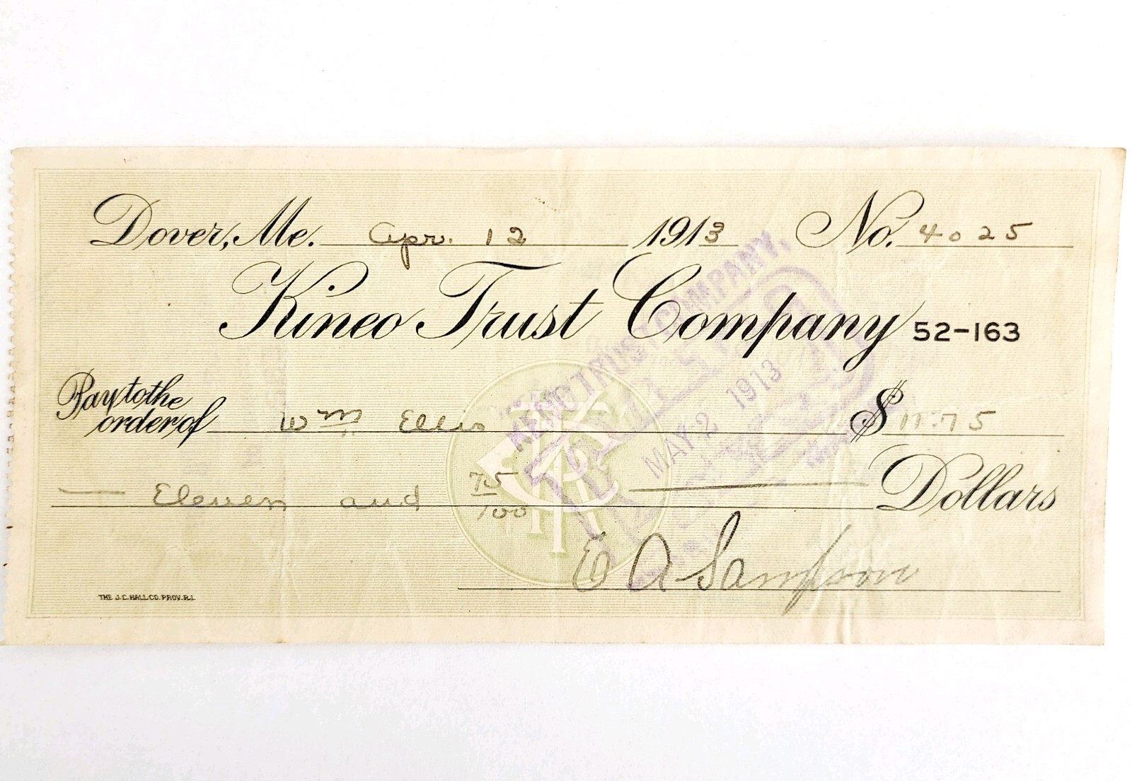 1913 Kineo Trust Company Bank Check E.A. Sampson Dover Maine Signed 4025 CHX5