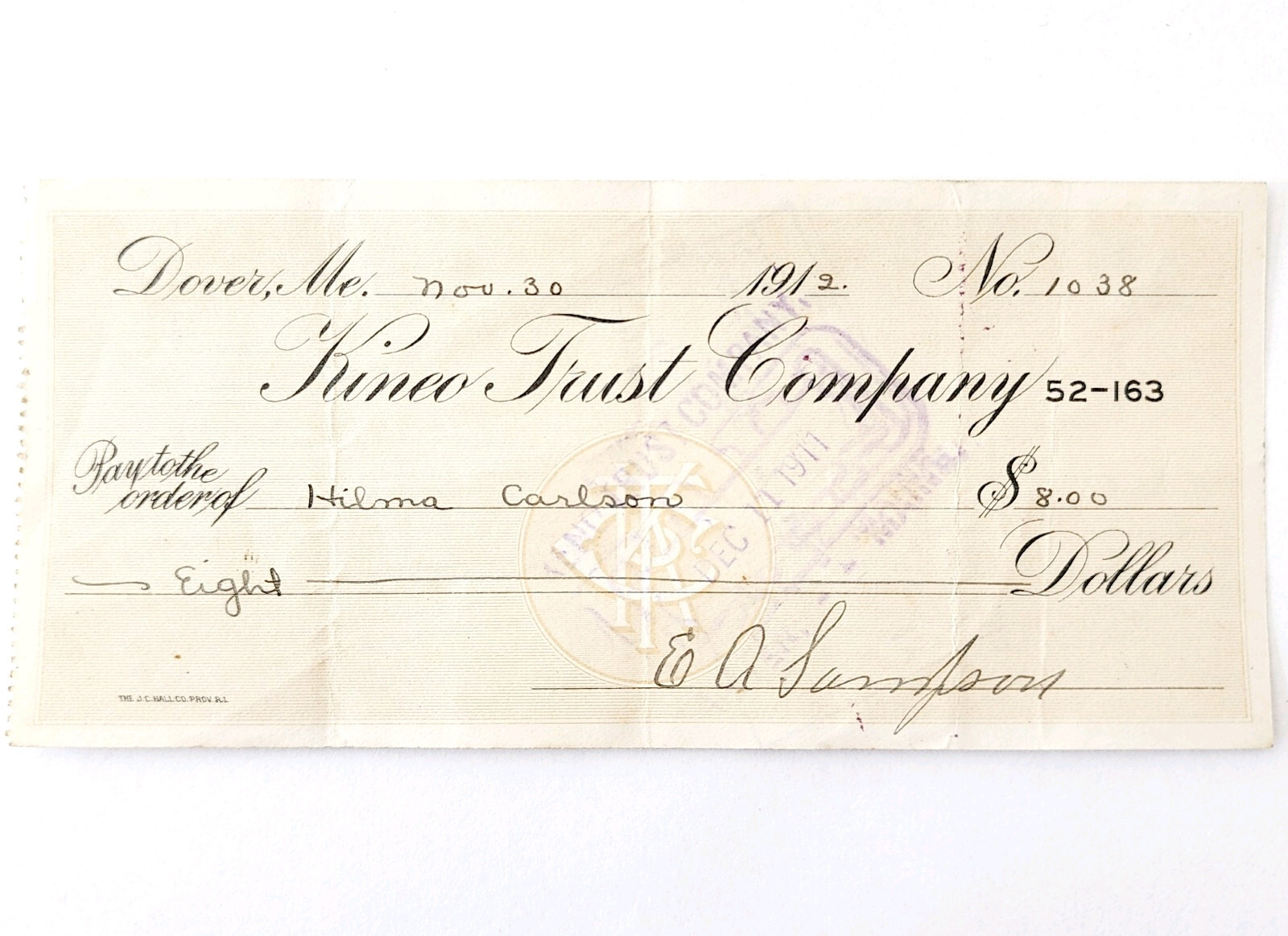 1912 Kineo Trust Company Bank Check E.A. Sampson Dover Maine Signed 1038 CHX4