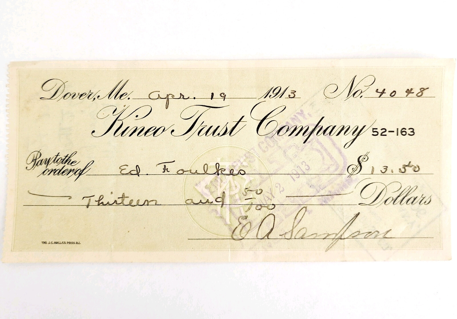 1913 Kineo Trust Company Bank Check E.A. Sampson Dover Maine Signed 4048 CHX5