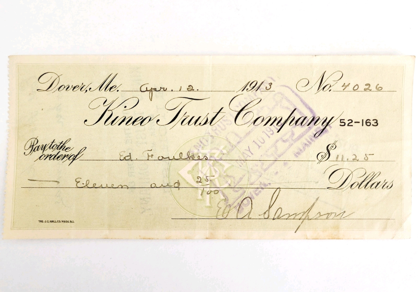 1913 Kineo Trust Company Bank Check E.A. Sampson Dover Maine Signed 4026 CHX6