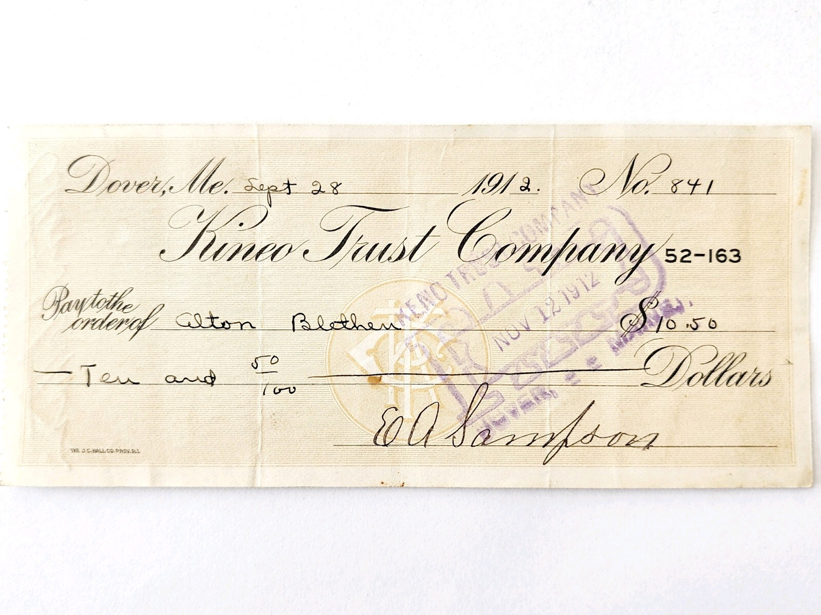 1912 Kineo Trust Company Bank Check E.A. Sampson Dover Maine Signed 841 CHX4