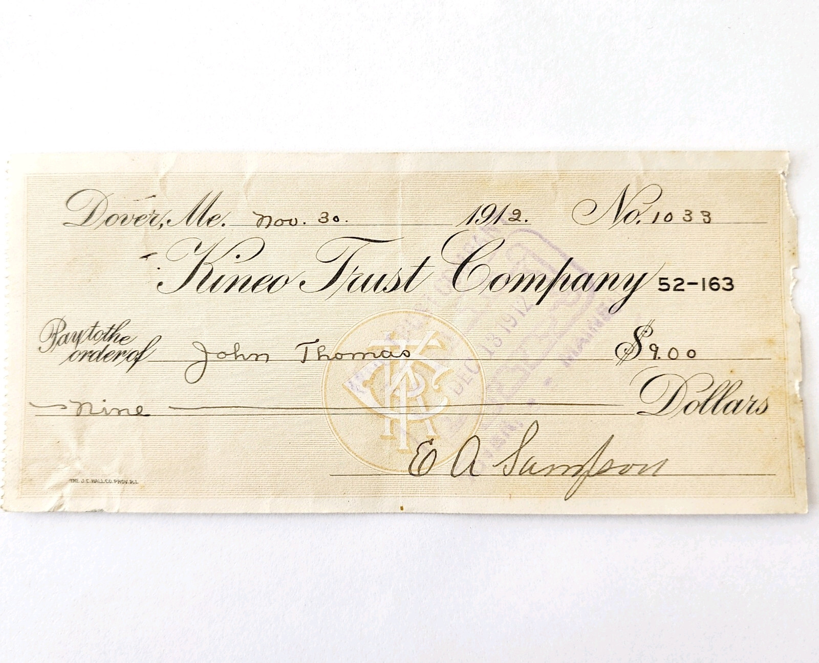 1912 Kineo Trust Company Bank Check E.A. Sampson Dover Maine Signed 1033 CHX4