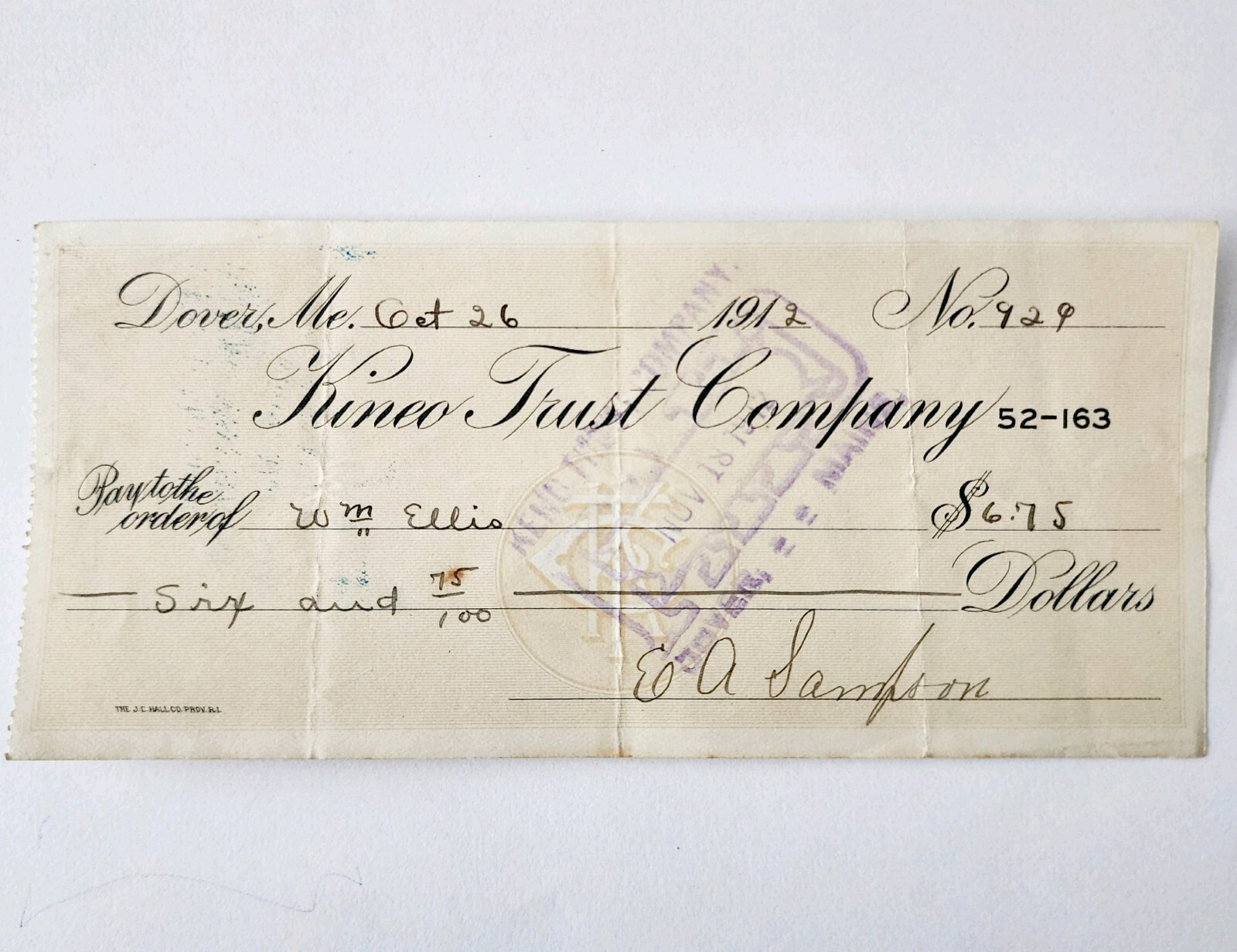 1912 Kineo Trust Company Bank Check E.A. Sampson Dover Maine Signed 929 CHX2