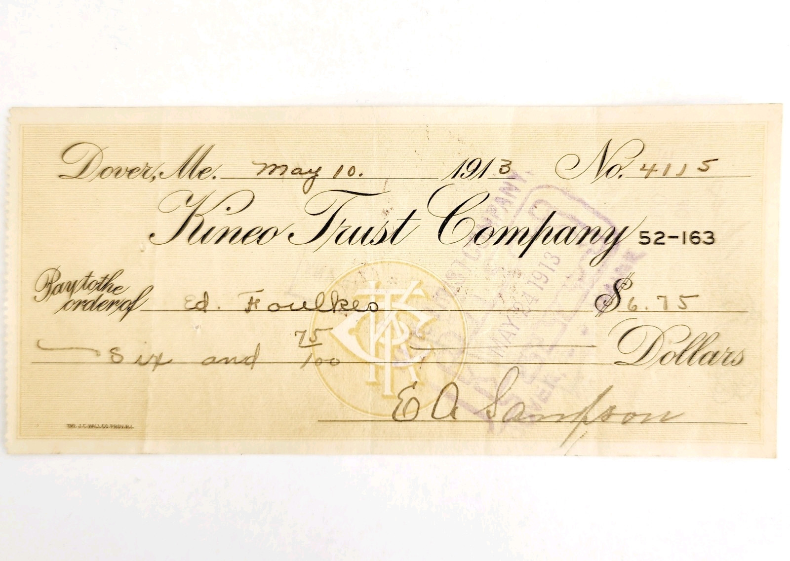 1913 Kineo Trust Company Bank Check E.A. Sampson Dover Maine Signed 4115 CHX6