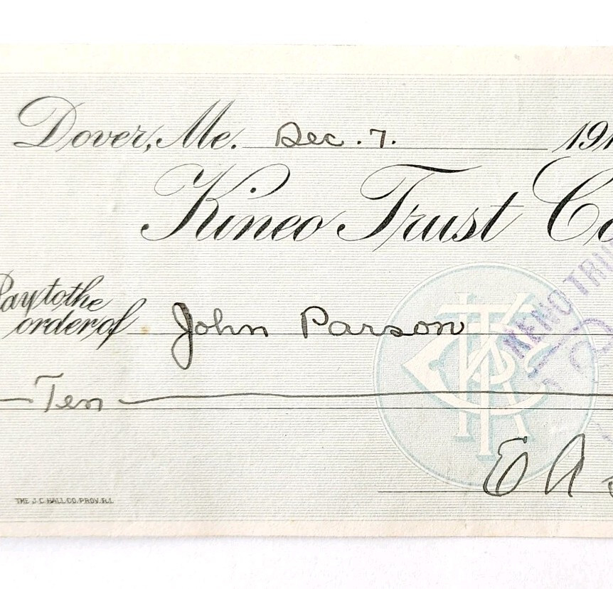 1912 Kineo Trust Company Bank Check E.A. Sampson Dover Maine Signed 1067 CHX4