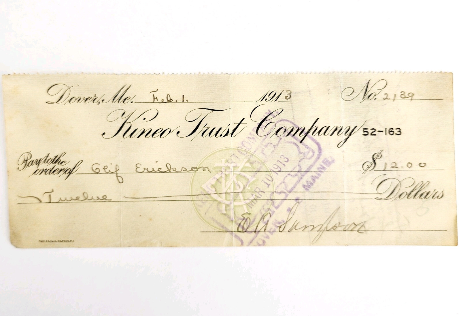 1913 Kineo Trust Company Bank Check E.A. Sampson Dover Maine Signed 2189 CHX6