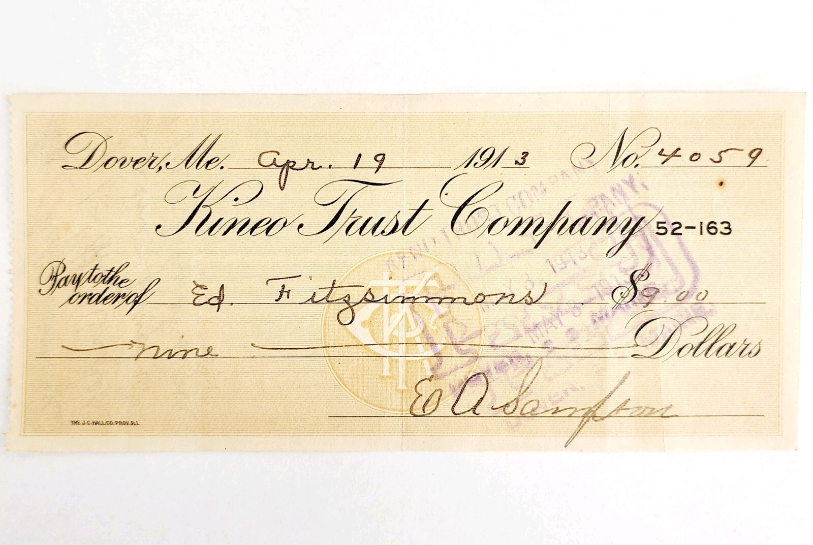 1913 Kineo Trust Company Bank Check E.A. Sampson Dover Maine Signed 4059 CHX5