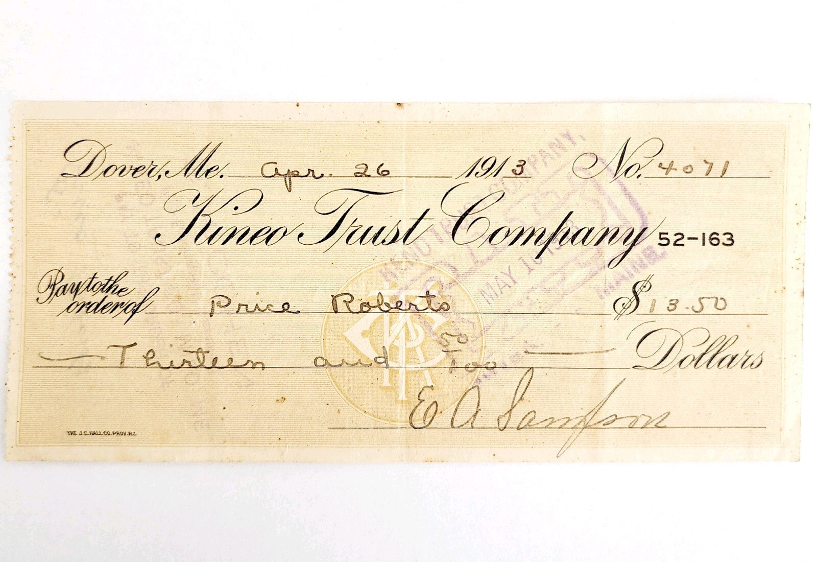 1913 Kineo Trust Company Bank Check E.A. Sampson Dover Maine Signed 4071 CHX6