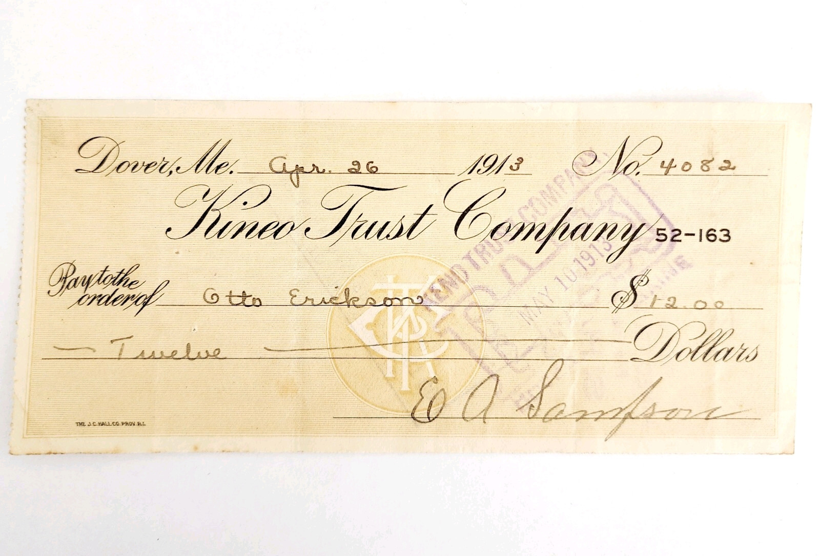 1913 Kineo Trust Company Bank Check E.A. Sampson Dover Maine Signed 4082 CHX6