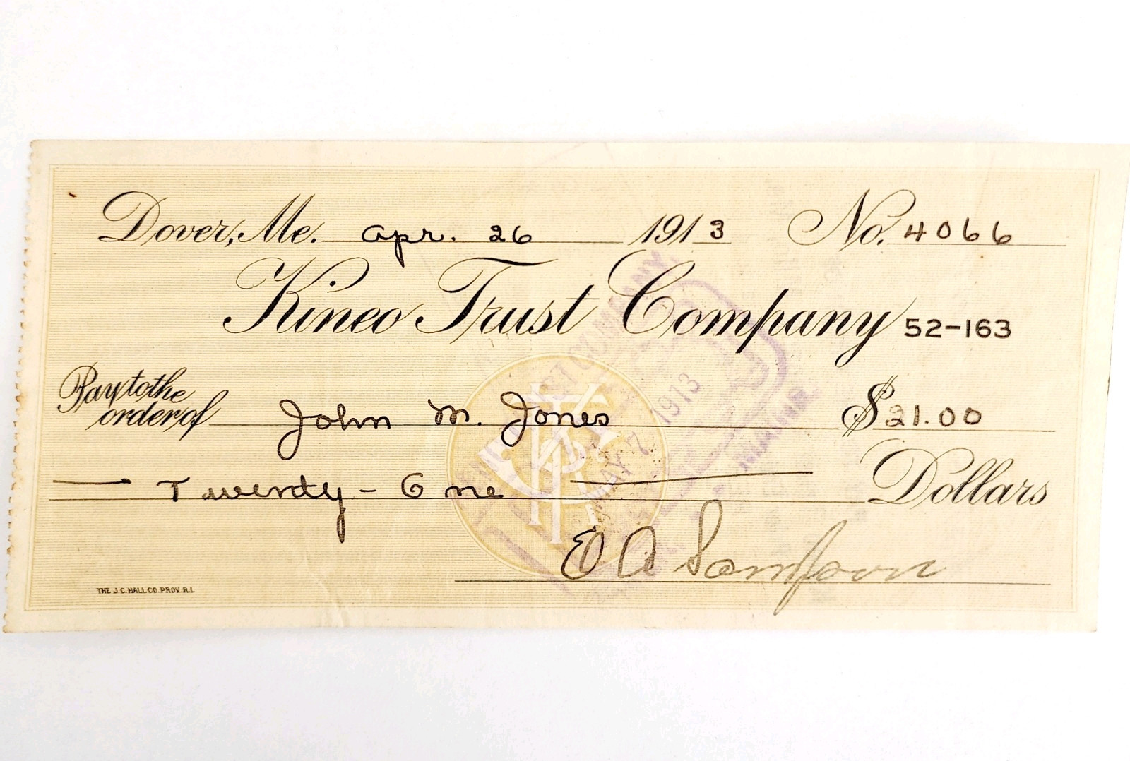 1913 Kineo Trust Company Bank Check E.A. Sampson Dover Maine Signed 4066 CHX6