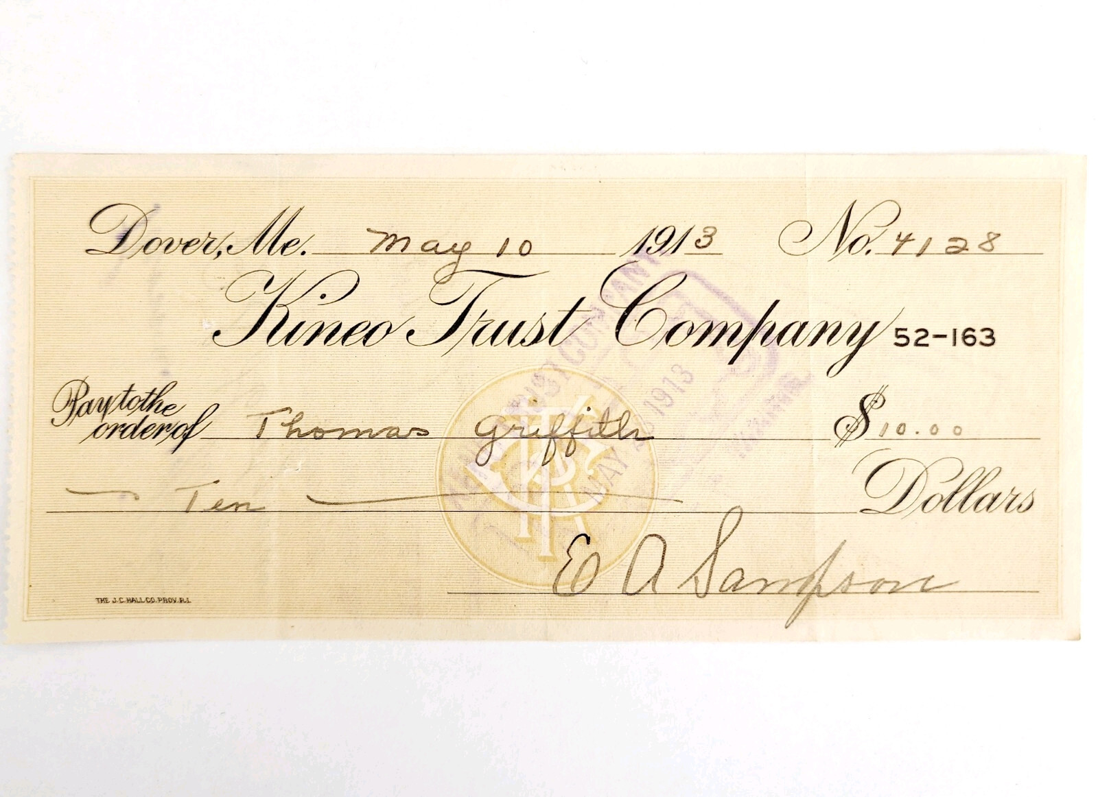 1913 Kineo Trust Company Bank Check E.A. Sampson Dover Maine Signed 4128 CHX6