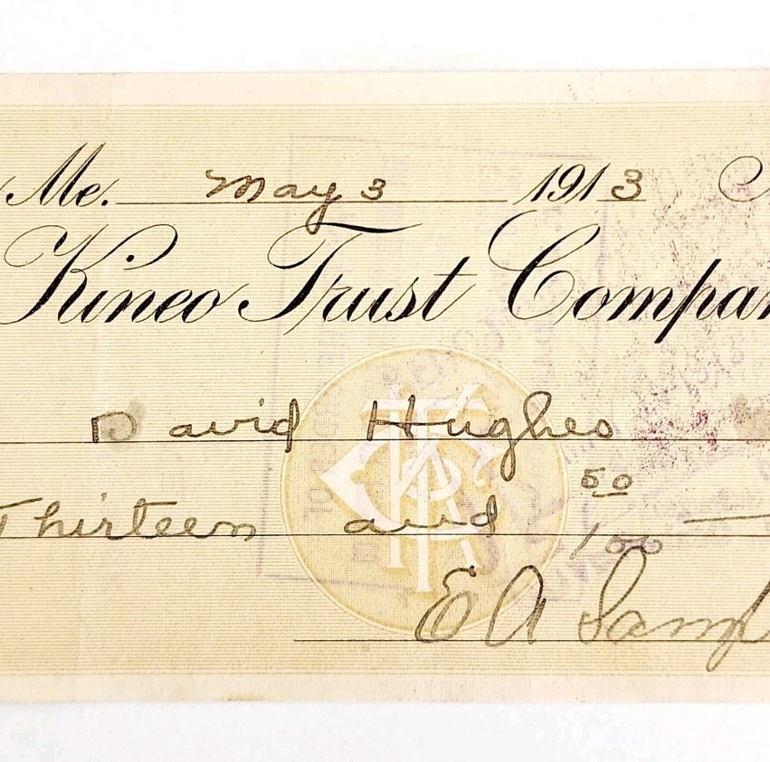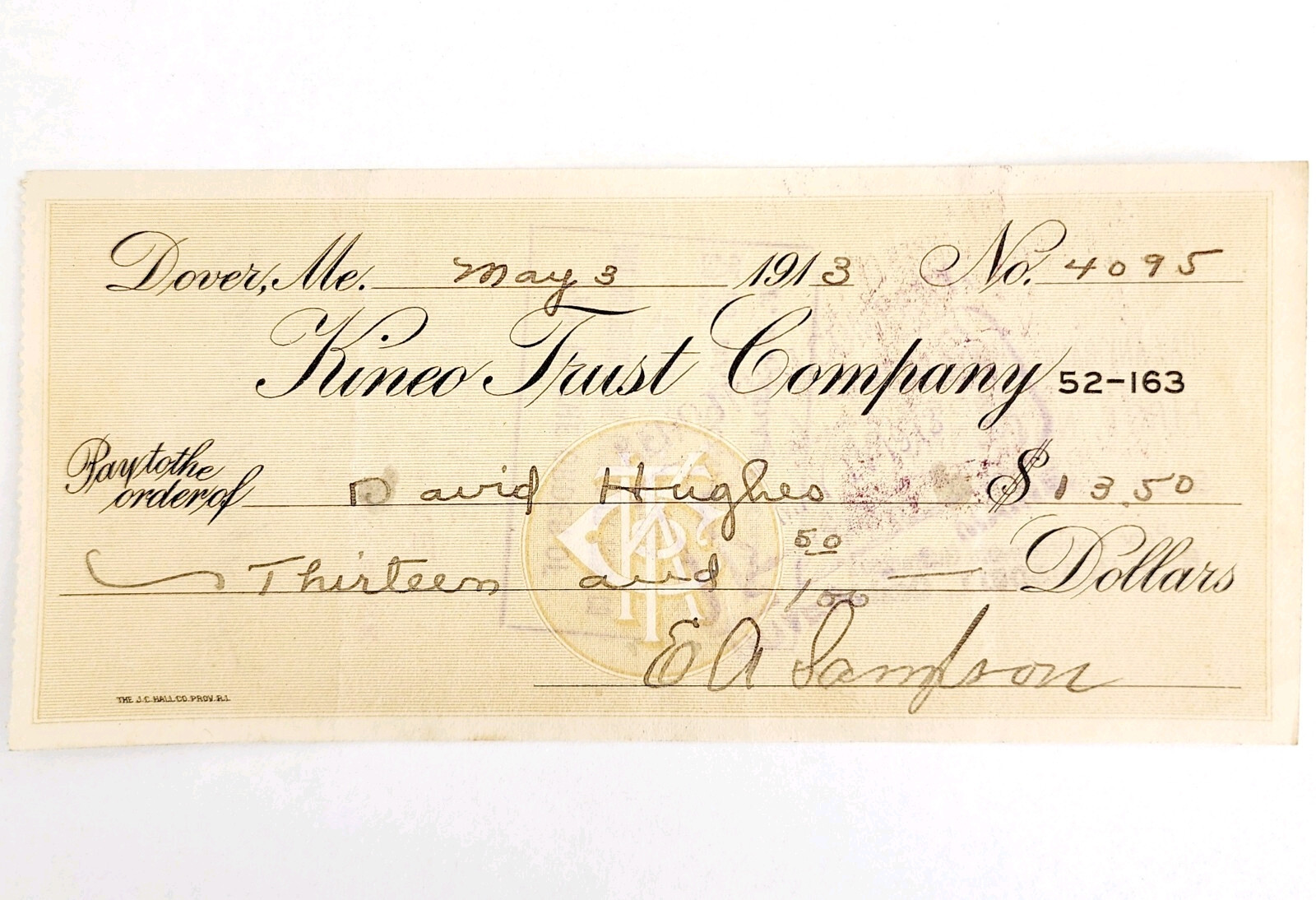 1913 Kineo Trust Company Bank Check E.A. Sampson Dover Maine Signed 4095 CHX5