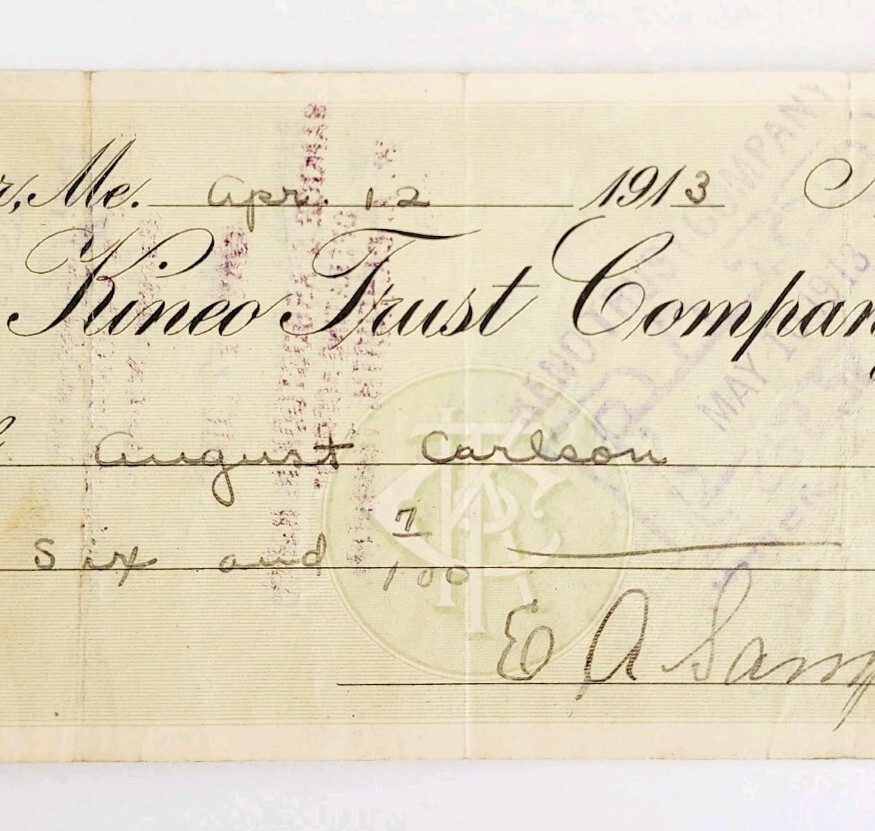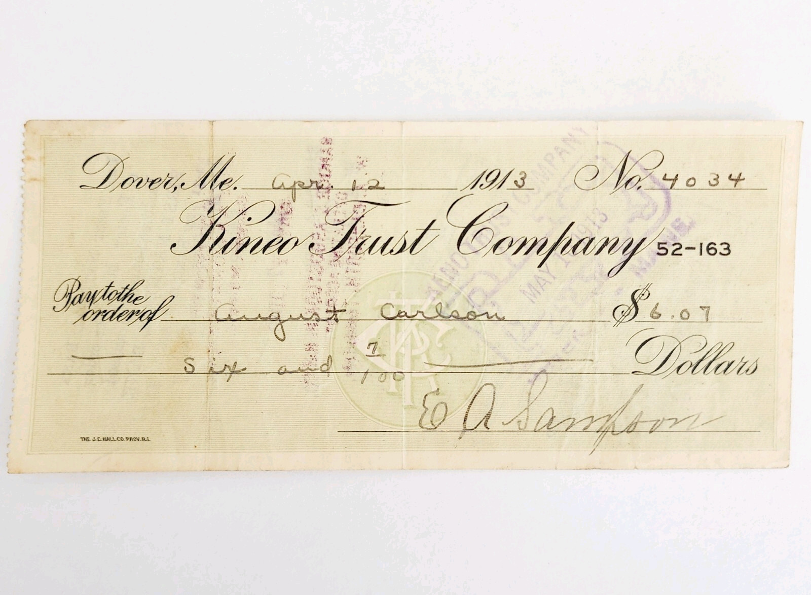1913 Kineo Trust Company Bank Check E.A. Sampson Dover Maine Signed 4034 CHX6