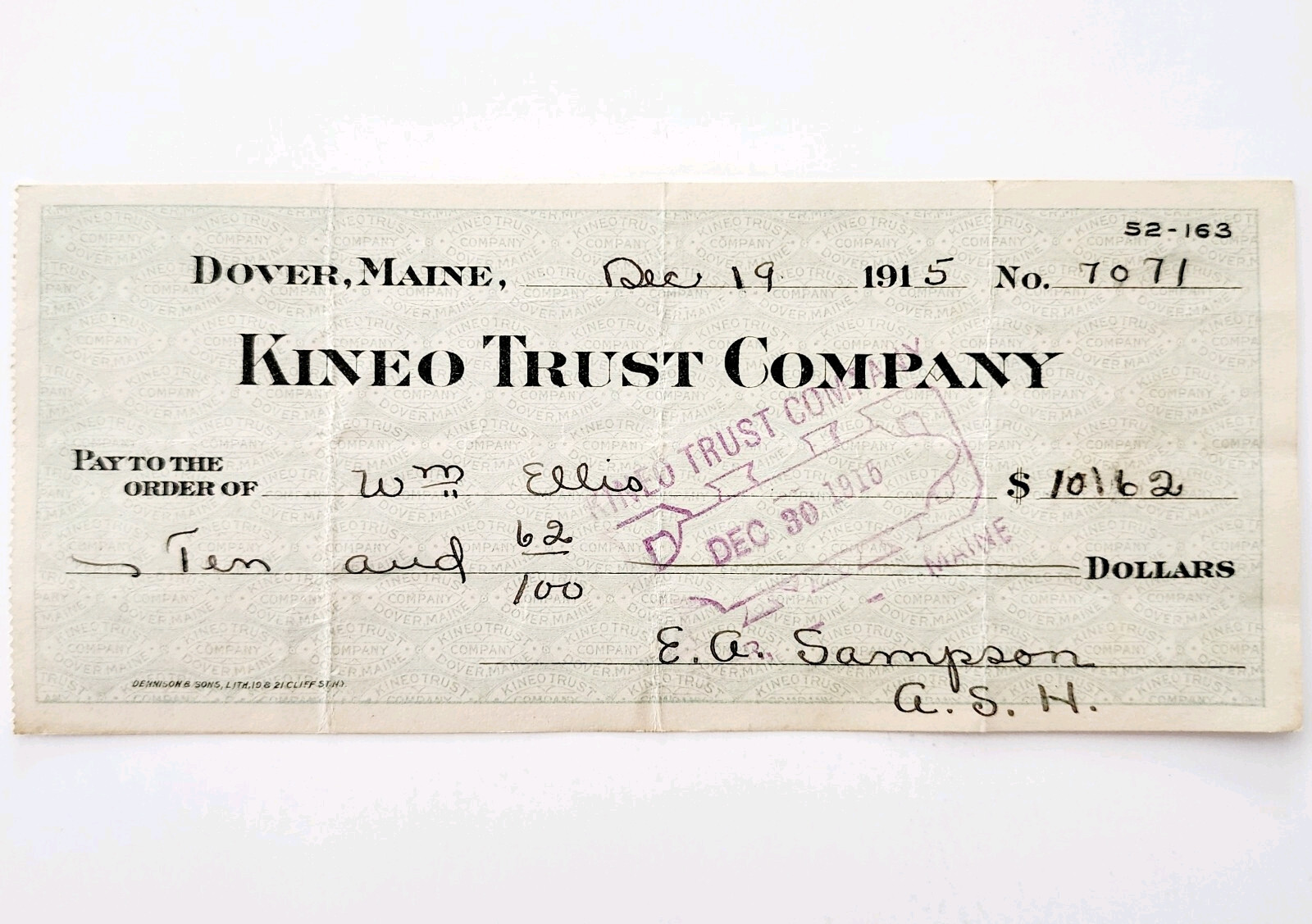 1915 Kineo Trust Company Bank Check E.A. Sampson Dover Maine Signed 7071 CHX15