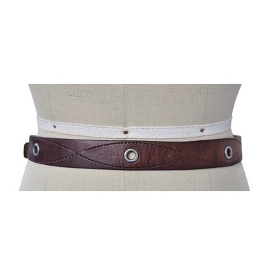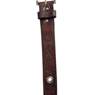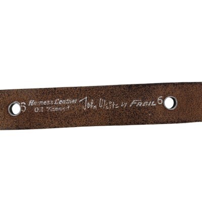 Nice, vintage, thick brown belt made of quality leather. It is brown with a brass buckle ( it has worn to a silver-tone) It has steel grommets and topstitching for interest, and the back is stamped John Weitz, by Fabil. No marked size but it measures 42 1/2" to the end, and 1 1/4" wide. In good used condition.