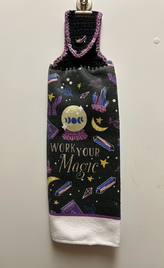 Great for Halloween and also if you like gothic or wicca.. this microfiber hanging towel is topped in black yarn and edge in a purple variegated glitter yarn..