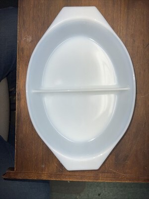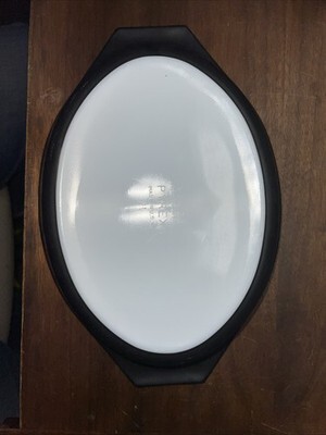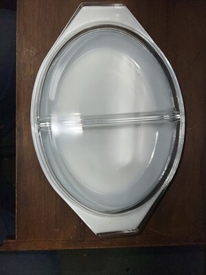 The PYREX Vintage Black Snowflake Divided Oval Casserole Baking Dish with Lid is a collectible piece of vintage cookware from the 1950s.