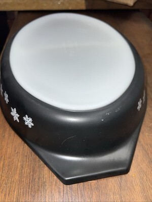 Made of milk glass with a black and white snowflake pattern, this 1.5 quart baking dish is a classic Pyrex casserole with a vintage design.