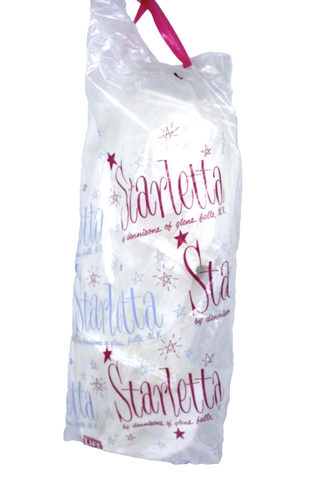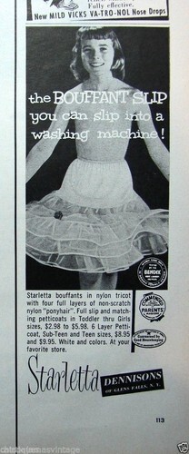 Sweet 1950s vintage "Starletta" organdy petticoat with stiff layered construction, perfect for creating a full circle silhouette. Features an elastic waist with stretch nylon upper and comes accented with a pretty rose pin. Includes an original vintage advertisement for the same style.
