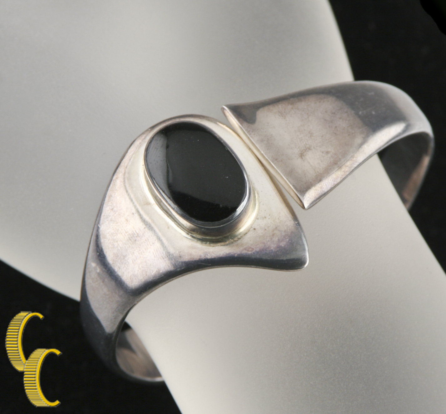 Signe Escorcia Manchette en argent artisanal mexicain, poinconnee .950, avec cabochon en onyx noir serti clos. Cette belle piece est dotee d'un mecanisme de charniere et d'un design de serrage.