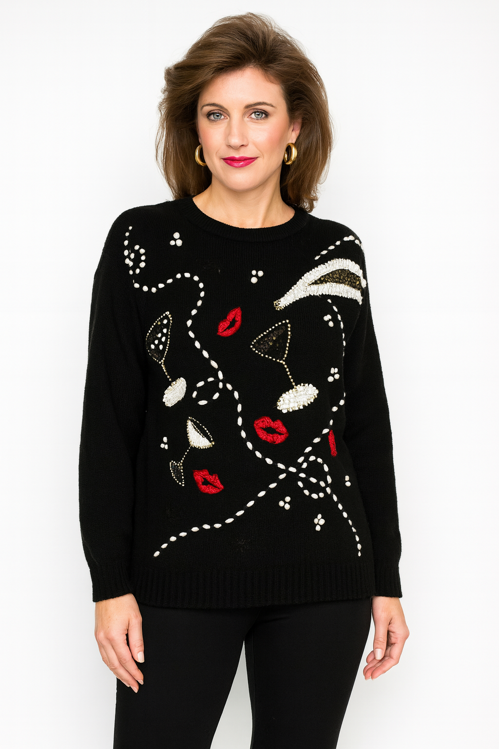 VTG A.M. Black Sweater Champagne Glass Red Lips Embellished NYE Party Sz L