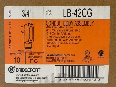 10PK Bridgeport LB-42CG ? Aluminum Type LB Conduit Body with Cover Gasket New The Bridgeport LB-42CG is a ? trade size, Type LB set-screw conduit body made of aluminum with an enamel-painted finish and a cover sealed by a neoprene gasket for protection. It provides 7.2 cu-in of capacity and is designed for use with rigid or IMC conduit systems to allow for inspection, pulling and maintenance. Threaded hub connections and a durable enclosure (NEMA FB-1) make it a reliable choice for industrial and commercial raceway installations. Listed by: Maksim (Sales Team) ?If you want more time, freedom, and energy, start saying no.?~ Unknown (A positive moment brought to you by Help Resale) About Us Welcome to Help Resale, your go-to consignment shop where value meets quality. At Help Resale, we're dedicated to providing you with an exceptional shopping experience, whether you're looking to find the best deals or consign your items. Need to buy a product, but don't see it in our store? Please feel free to reach out to us and we will help you find it! Help Resale 7200 Fair Oaks Blvd Suite 120 Carmichael CA 95608 Business Hours: Monday-Friday: 9:00 am to 5:00 pm (PST) All product and company names are trademarks TM or registered trademarks of their respective holders. Use of them does not imply any affiliation with or endorsement by them.