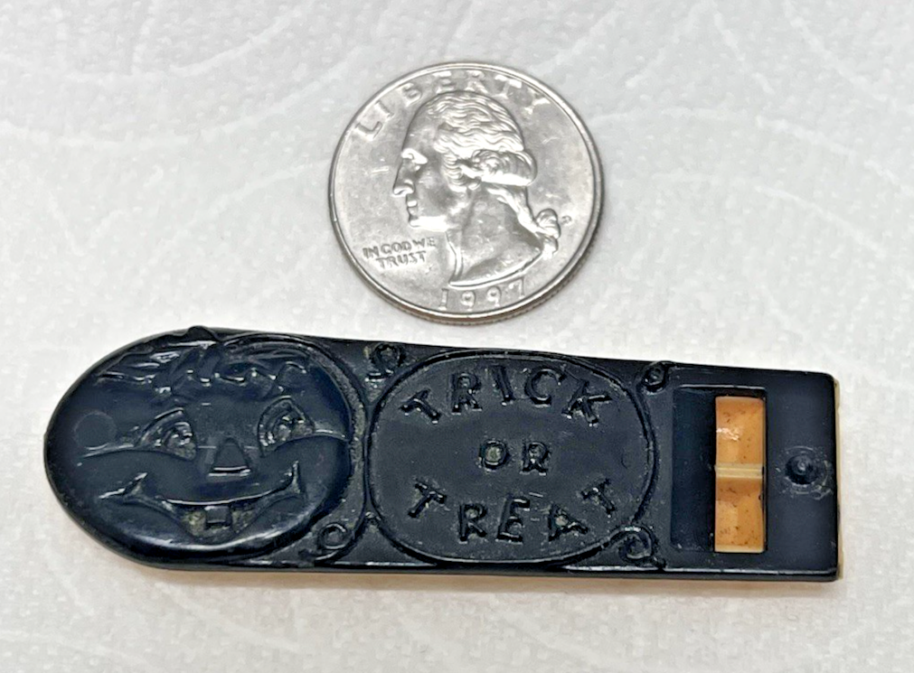 Vintage Plastic Halloween Trick or Treat Whistle Jack-o-Lantern Black Orange