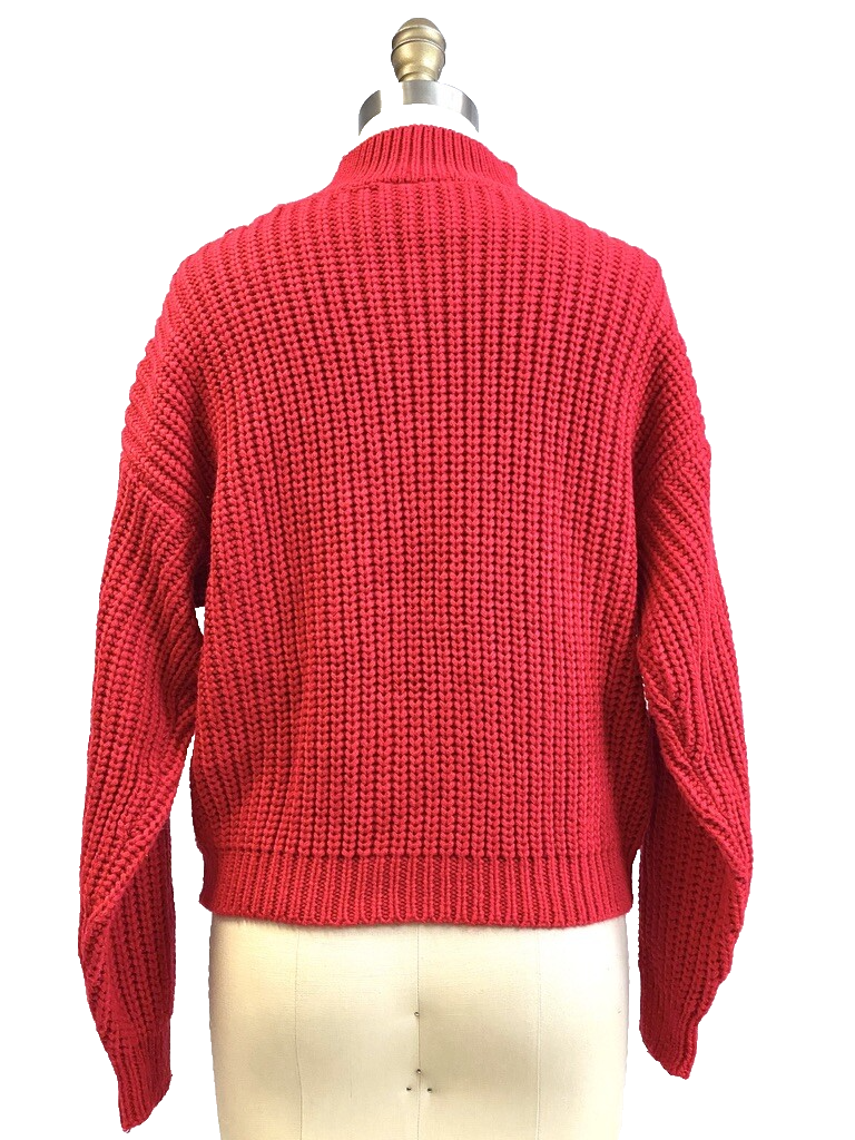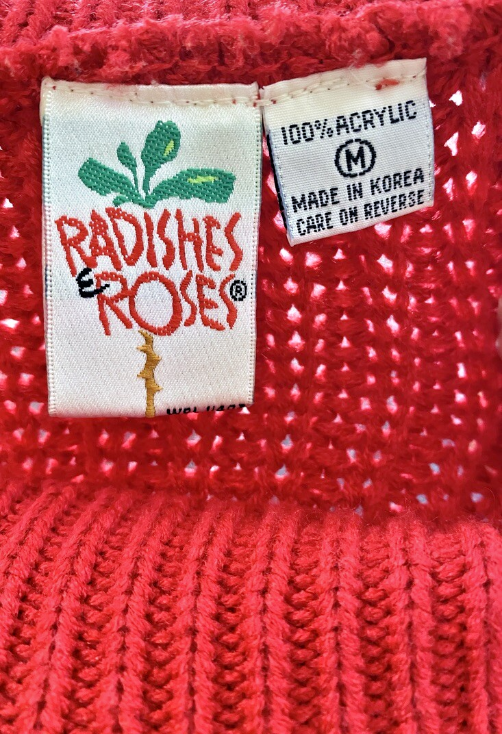 Quirky vintage 1980s cropped sweater in chunky red acrylic knit, decorated with whimsical radishes and roses. Features dropped shoulders, ribbed waistband, and a boxy cropped cut with pocket detail. Made in Korea. A perfect novelty knit collectible with a playful 80s aesthetic.