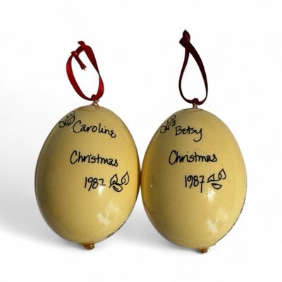 You will receive both hand painted egg Christmas Ornaments. Bot ornaments are slightly different. Each one is dedicated to a different person. At first I thought these eggs were paper mache. Upon a firther look and looking at the texture I realized these are real Chicken eggs. These eggs seem to have some kind of hard finish so they are not very breakable. The seem very sturdy for an egg.