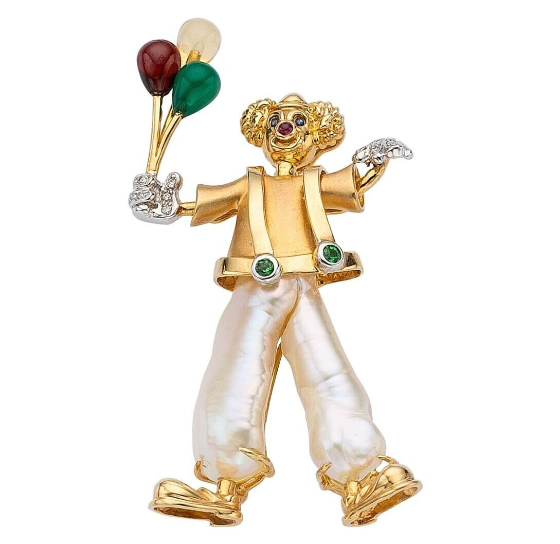 18k Yellow Gold Multi-Gem Cultured Pearl Clown Brooch Adorable