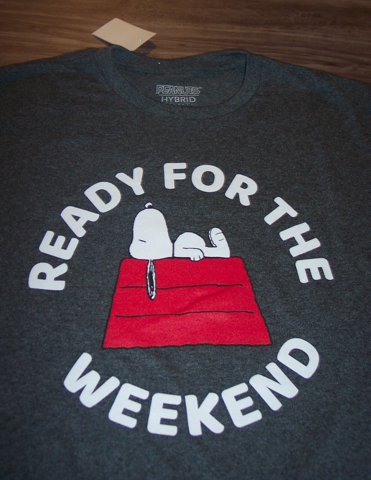 This is a PEANUTS SNOOPY Ready For the Weekend T-shirt. It is a size LARGE, and it is NEW with the tag. It is 22 1/2 inches from armpit to armpit and 30 inches in length. The Print is made to look vintage. Combine auctions to save on shipping. AG