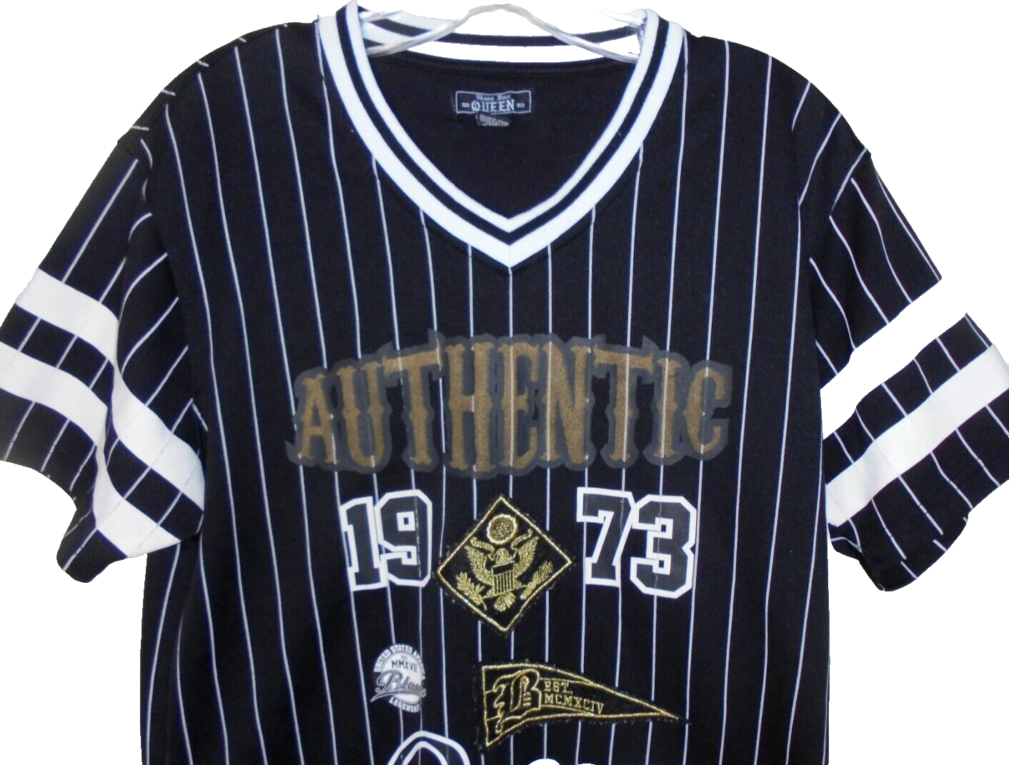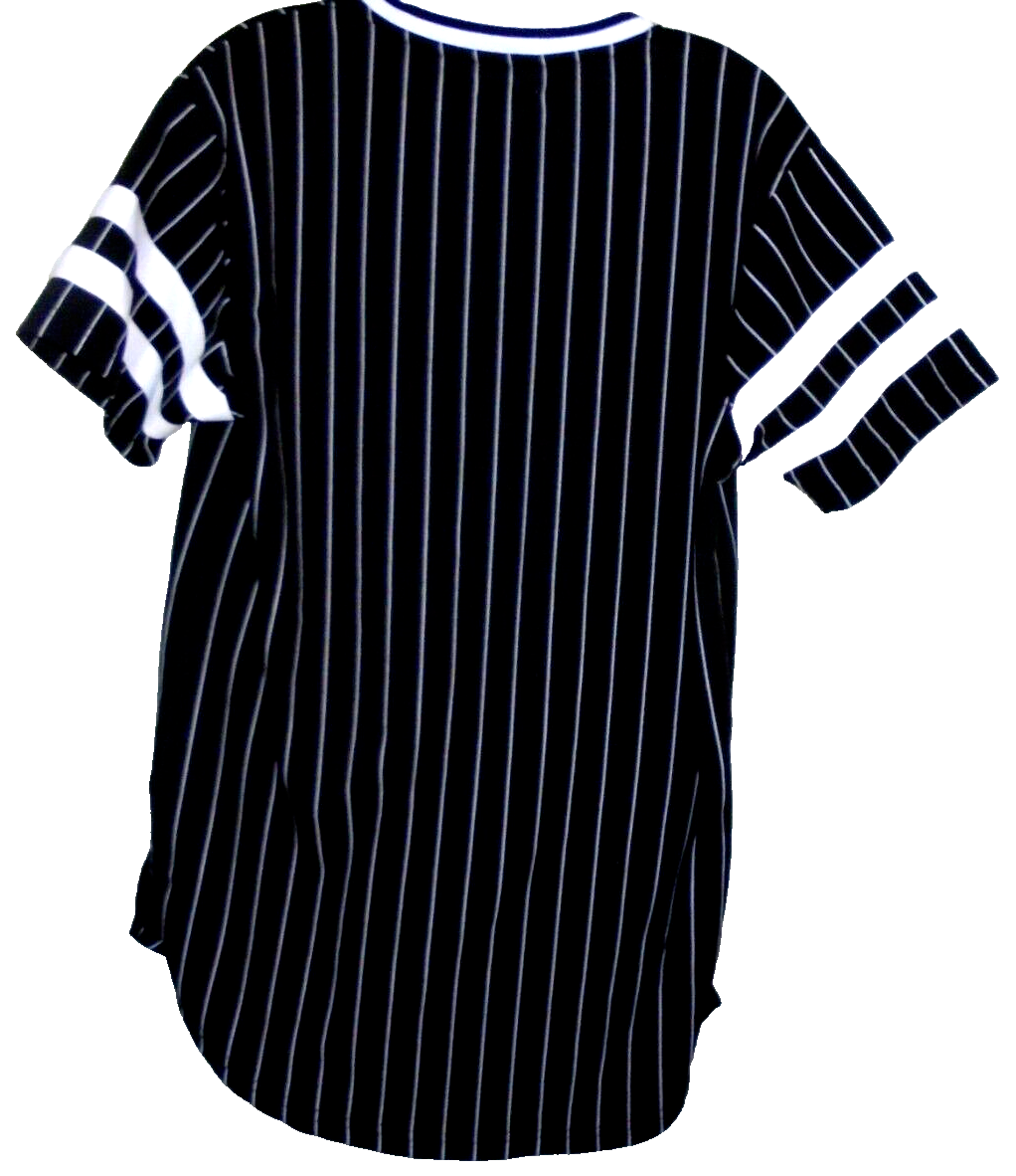 Description: Very nice baseball style jersey with black and white striping and embroidery and screen print items on front.