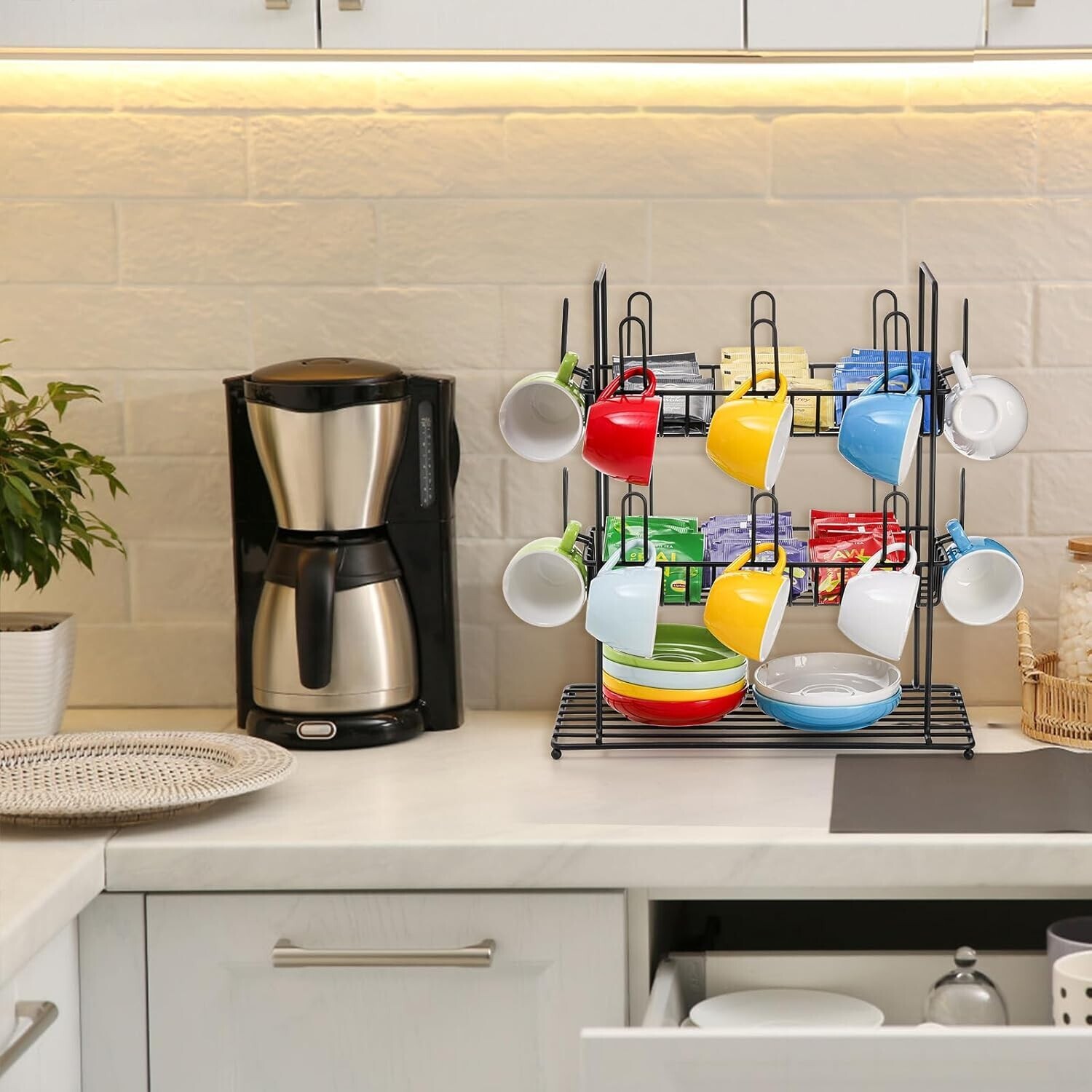 Maximize Your Countertop Space - The countertop mug holder is designed with 16 hooks that can hold as many as 16 coffee mugs. It also features 2 storage shelves and a bottom shelf for storing coffee pods, tea bags, and other small items. Its compact design ensures it occupies minimal counter space while keeping your mugs conveniently accessible and neatly arranged.
