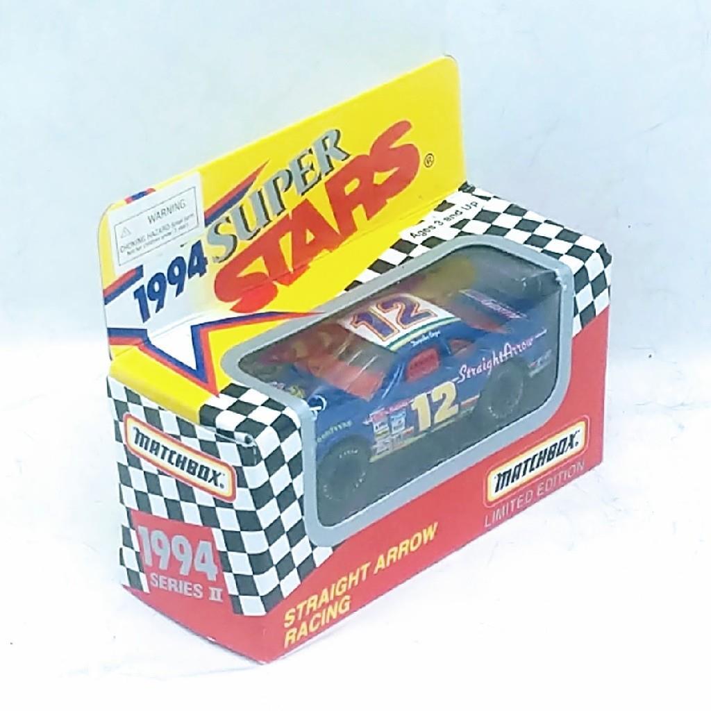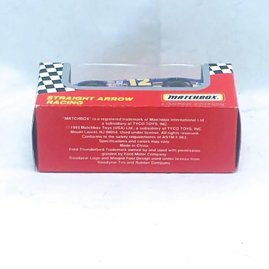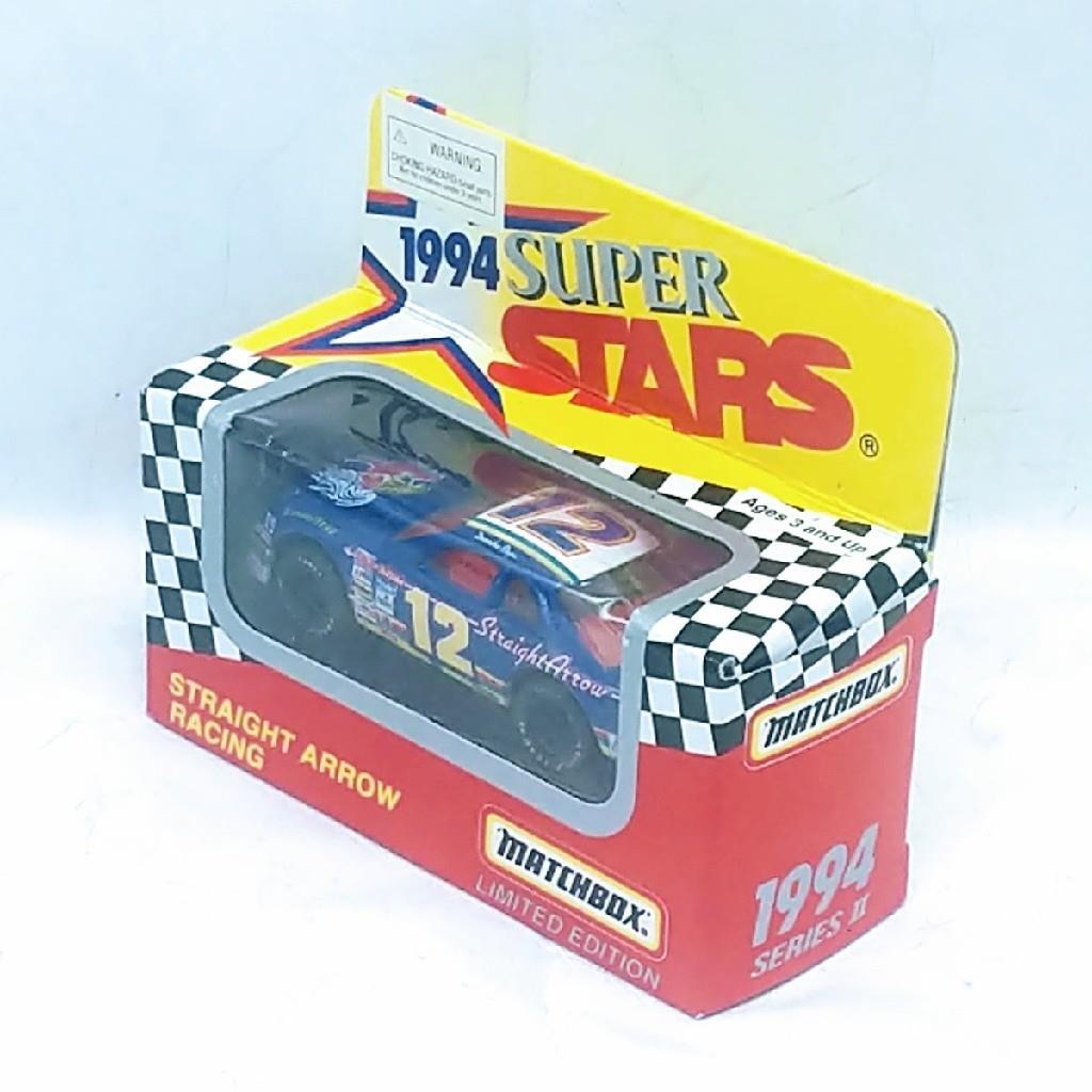 Up for grabs is a limited edition unopened box of the 1994 Matchbox Superstars 12 Blue Straight Arrow Racing Bobby Allison Thunderbird. This diecast model of the Ford Thunderbird is perfect for collectors of NASCAR racecars and fans of the sport. The vehicle is made of pressed steel and is in 1:64 scale.