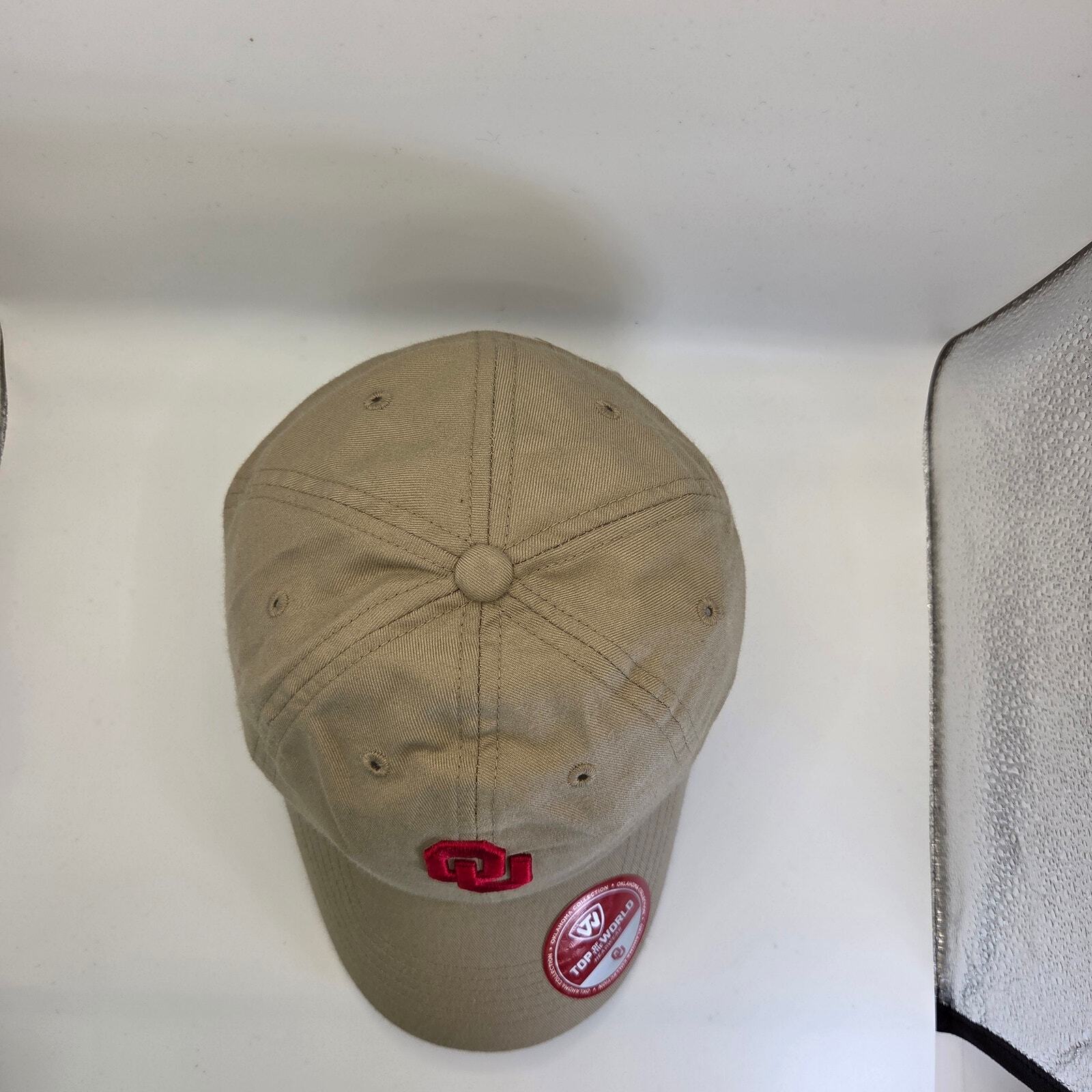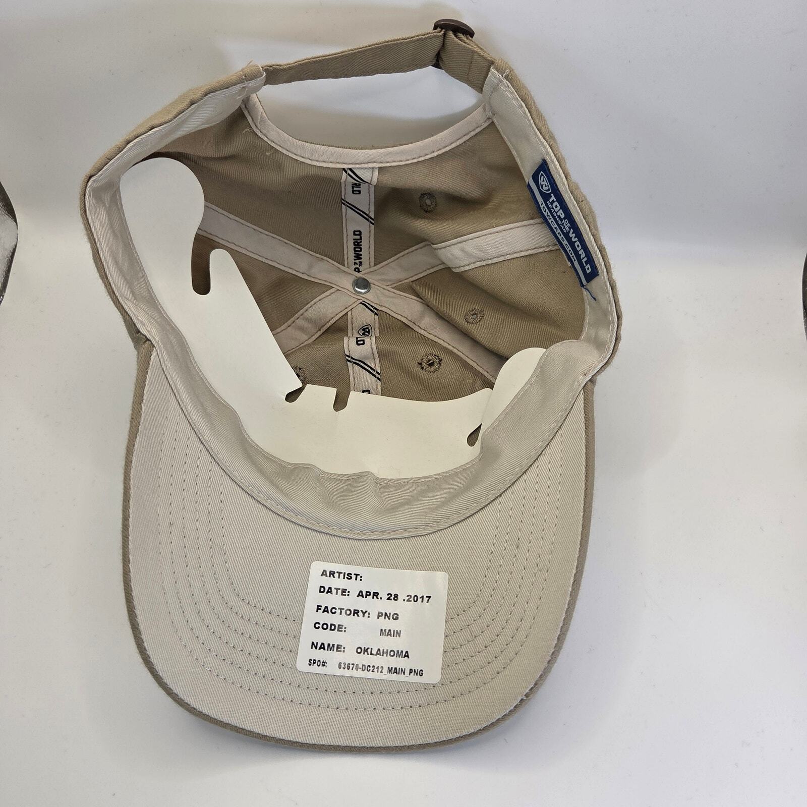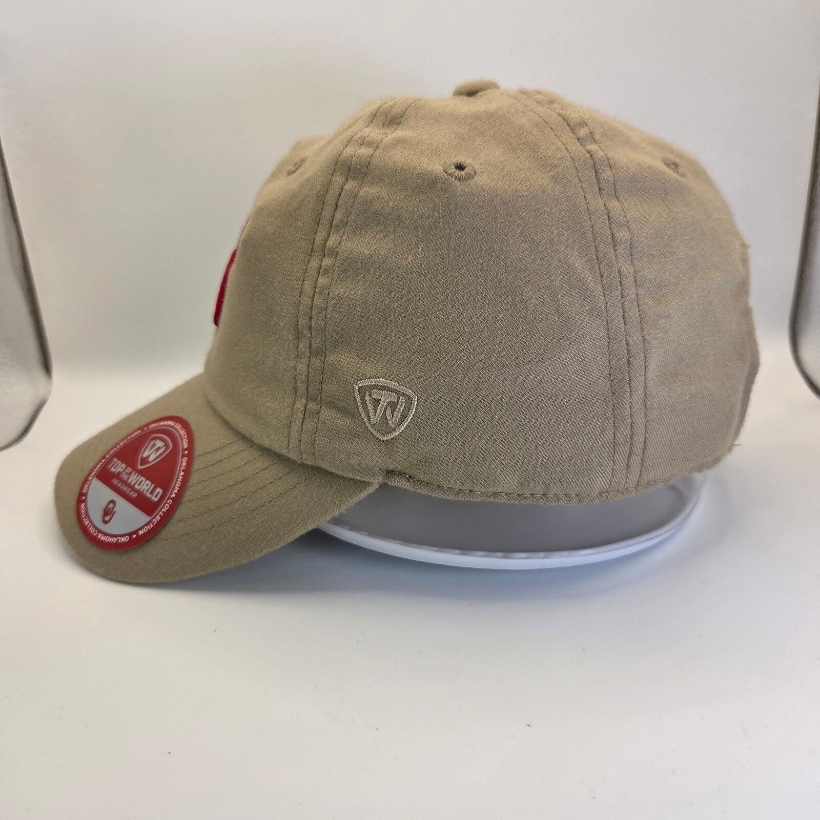 Support the Oklahoma Sooners with this classic tan hat from Top of the World. Featuring the red OU logo on the front and an adjustable claspback closure, this cap is made from 100% cotton for a comfortable fit. Appears new with original stickers still attached.