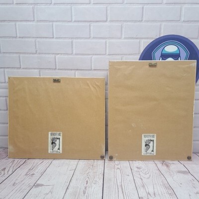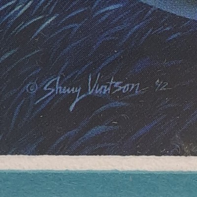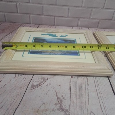 The product is a pair of vintage 90s Sherry Vintson manatee framed 8x10 art prints in blue. The prints are made of matte paper. The artist, Sherry Vintson, is from Florida, USA and the prints are from the years 1991 and 1992. The style of the prints is realism and they are collectible pieces. The prints are matted and showcase a small size of 12.5 inches in length and 10.5 inches in width, with an item height of 1 inch.