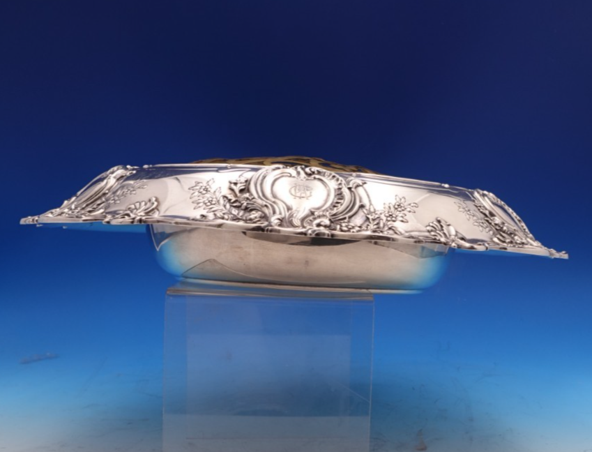 Lovely Florentine by Tiffany and Co sterling silver flower arranger with brass frog insert marked #18474/1328. This piece measures 14 1/2" (l) x 14 1/2" (w) x 3 3/4" (h) and weighs 42.05 troy ounces (without insert). It is monogrammed (see photos), and is in good estate condition as shown. Beautiful!