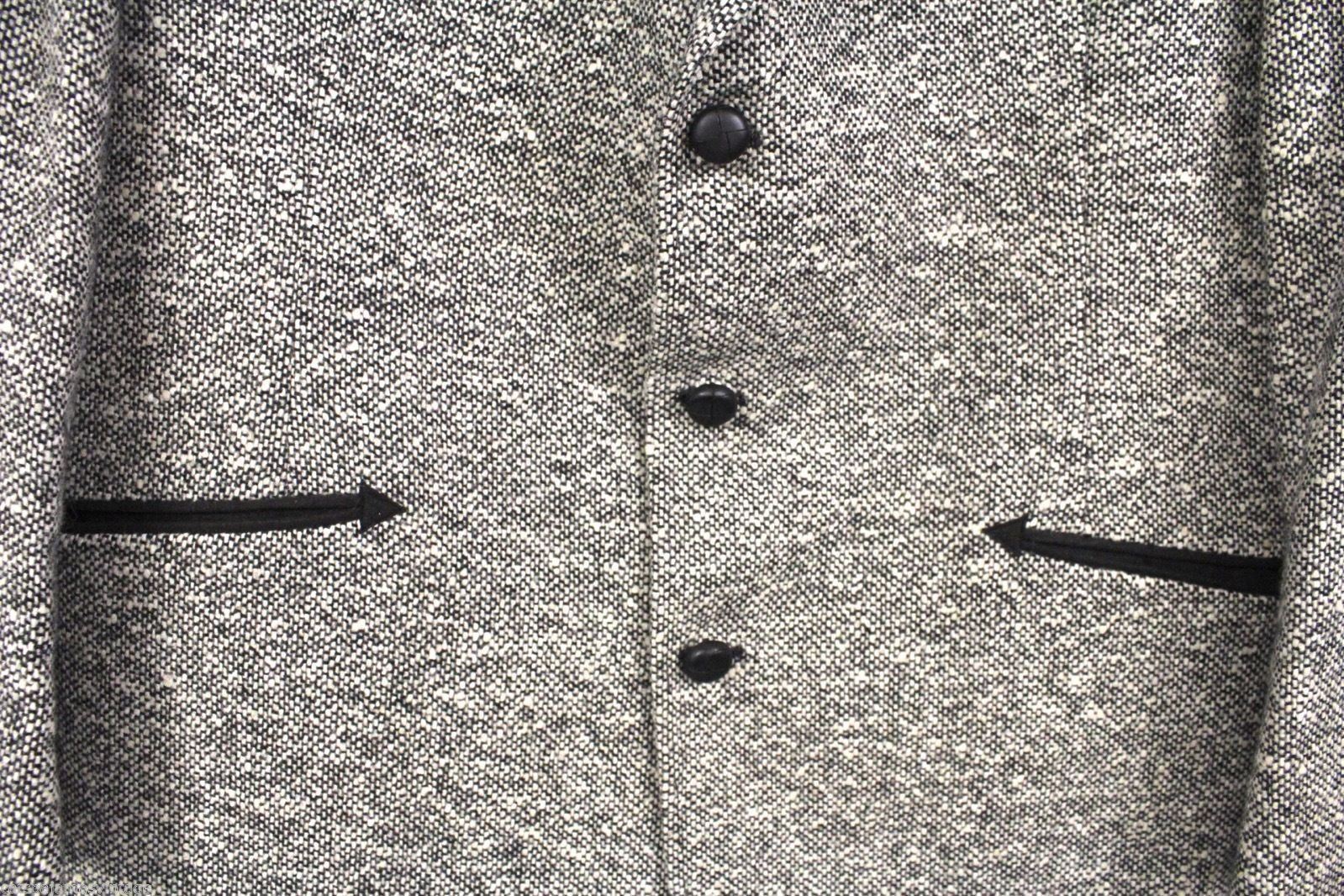 Sharp vintage 1970s men?s western sport coat from Al Rivera?s Embarcadero, San Diego. Crafted in a salt-and-pepper black-and-white wool tweed with distinctive western styling: peaked back yoke, ?smile? front pockets, and quarter lining. Classic 70s western-meets-urban tailoring.