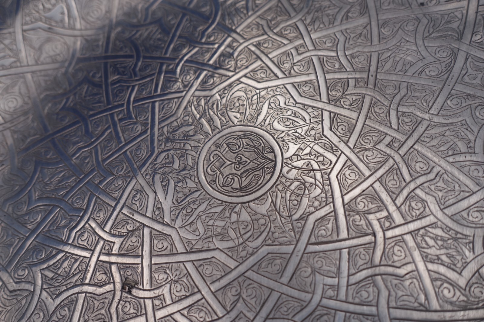 Remarkable Egyptian .900 silver hand engraved serving plate featuring a beautiful medallion in the center and it has black antiquing detail (maker unknown). It is circa 1916-1946.