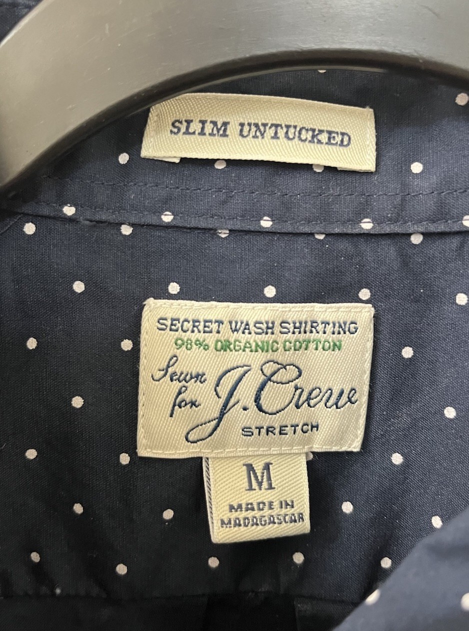 This NWT J Crew shirt for men in size M is a stylish blue polka dot slim untucked shirt made of stretch cotton. It features a collared neckline, long sleeves, and a button-down closure. The classic and preppy design is perfect for all seasons, and the lightweight and easy-care fabric ensures comfort and convenience. With its slim fit and woven construction, this button-up shirt from J.CREW is a versatile addition to any man's wardrobe, suitable for both casual and dressy occasions. Please let me know if you have any questions!